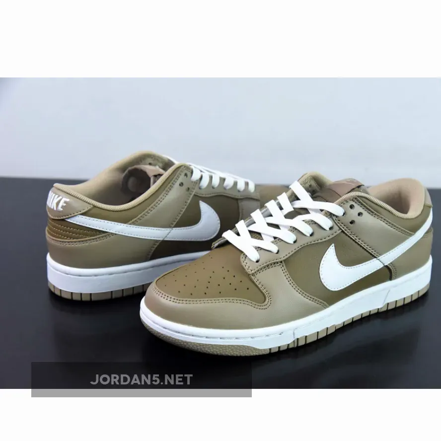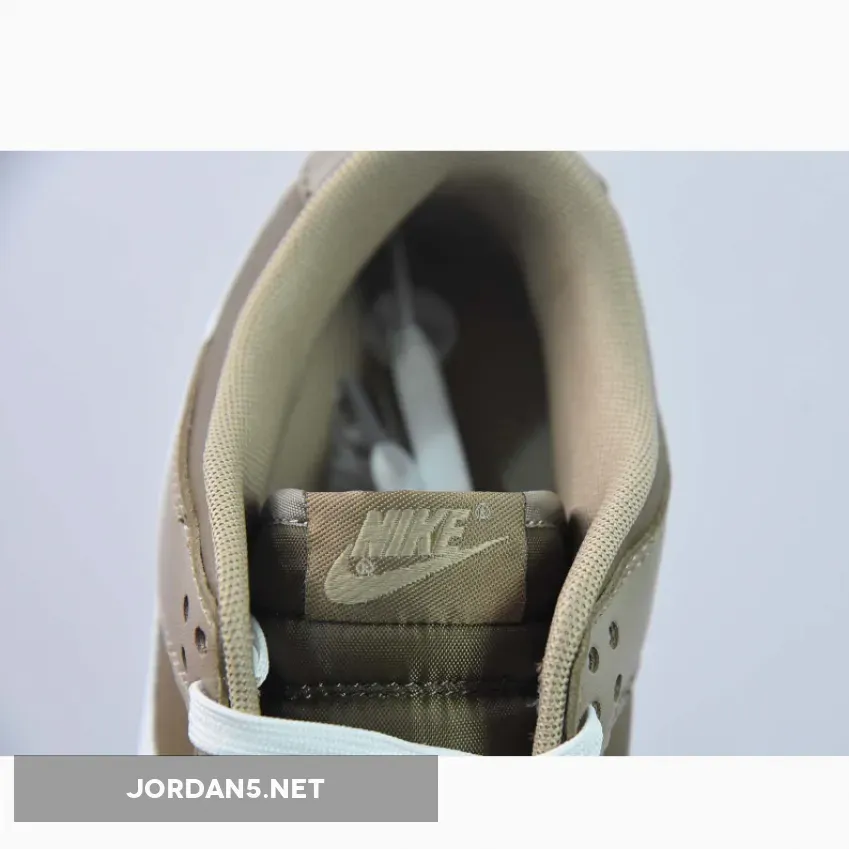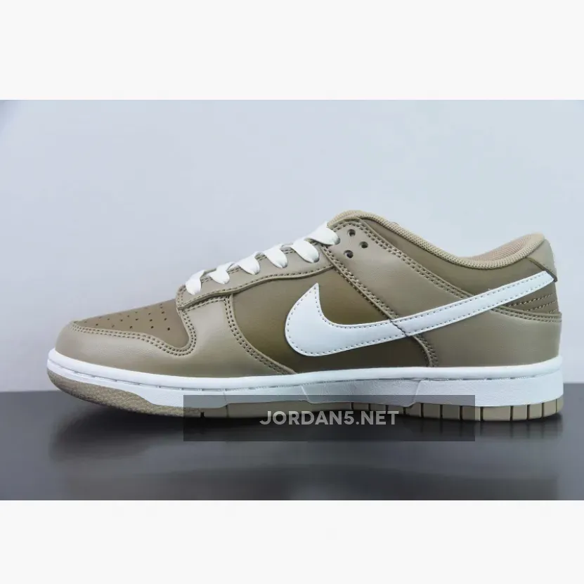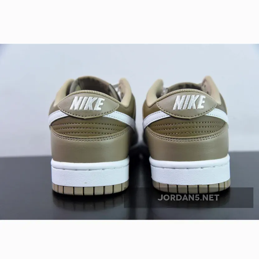 This Dunk Low has a tumbled leather base in a mocha brown shade. The overlays are in contrasting light tan. The mostly brown upper set of the white smooth leather Swooshes on the medial and lateral sides of the shoe very nicely. The mocha brown nylon tongue features a light brown Nike logo while the Nike text logo is embroidered in white on the tan-coloured heel tabs. White Swooshes, laces, and midsole atop a Tan-colored rubber outsole completes the design.
