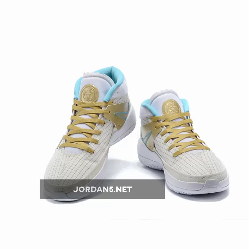 This Nike KD 13 comes with White across the upper with a grid pattern while Gold lands on the Swoosh, overlay by the heel and laces. Blue accents the trimming, covers the liner and co-branding on the heel and tongue. Finishing the look is mostly White on the outsole.