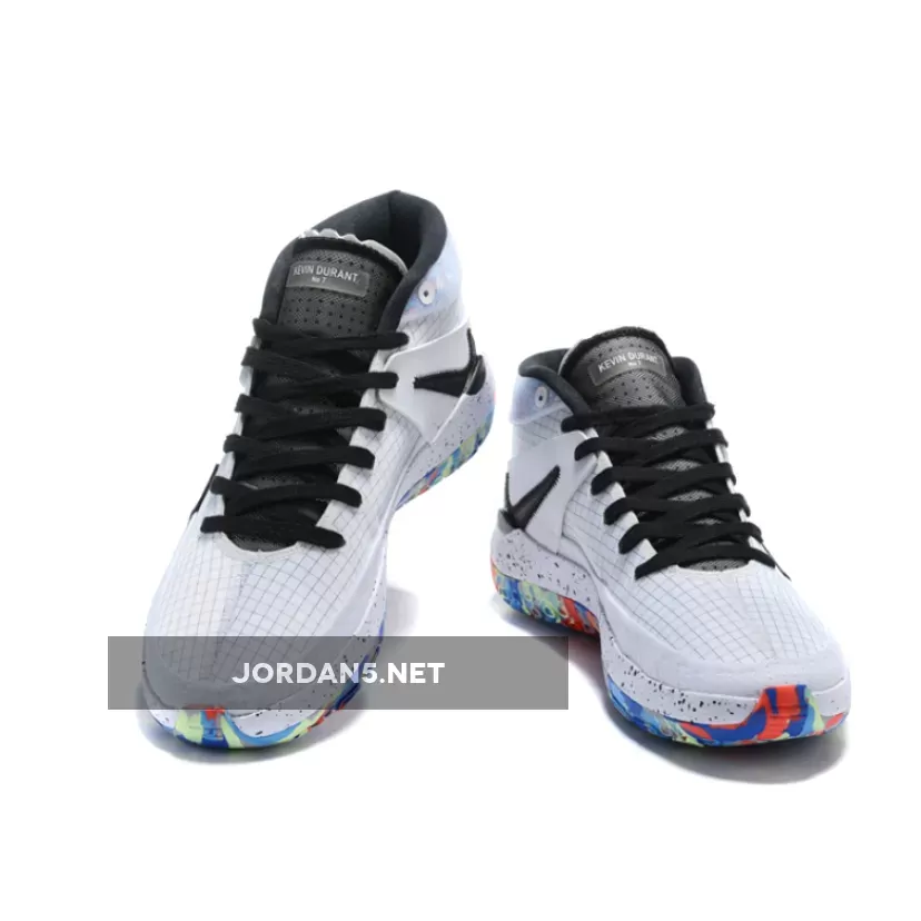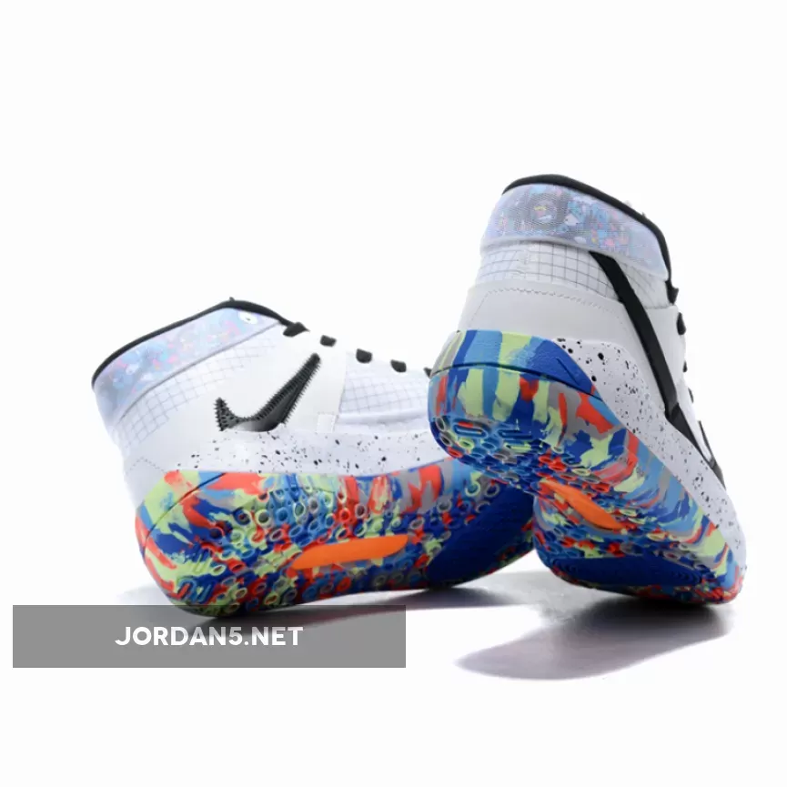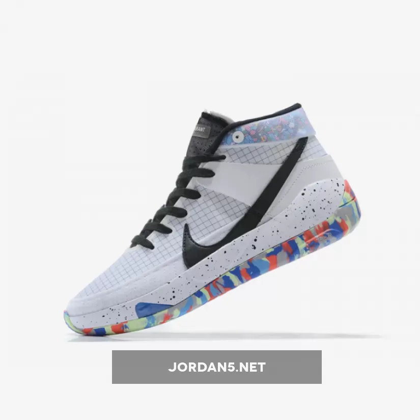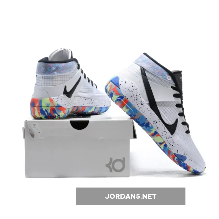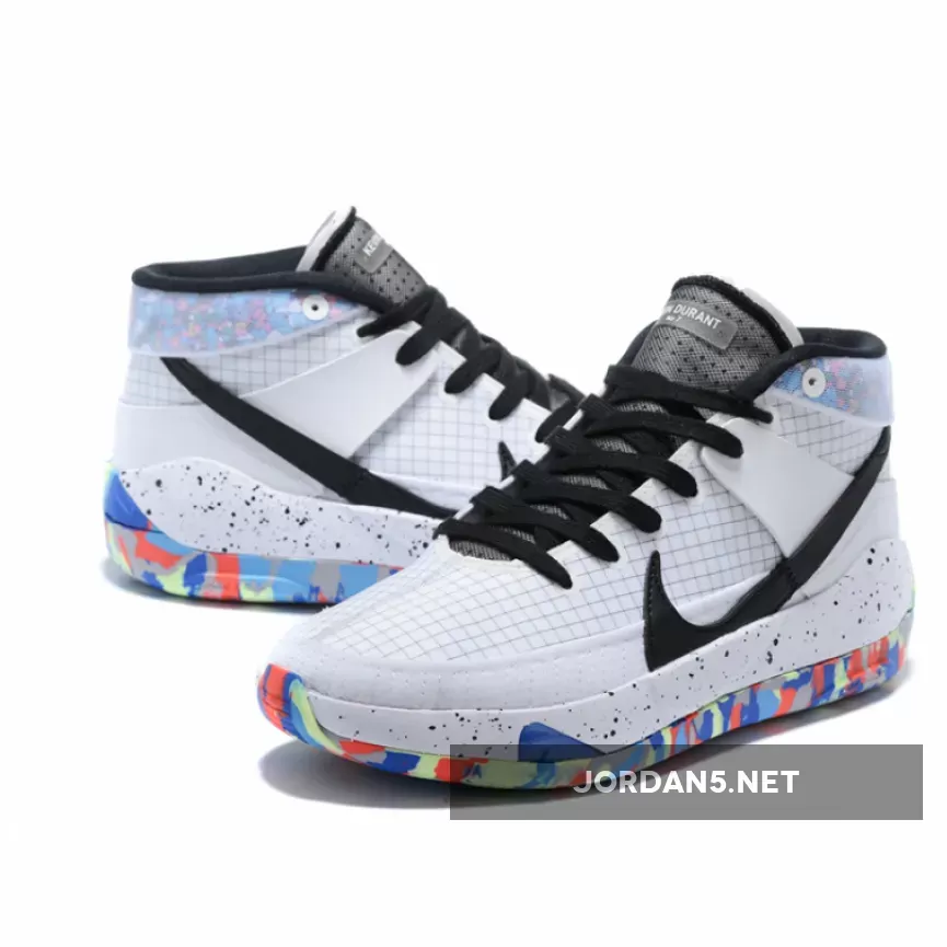 This Nike KD 13 comes dressed in a Multi-Color, Racer Blue and Smoke Grey color combination. Highlighted with White on the base while a Black grid runs across the base. The same shade then lands on the tongue, laces, Swoosh logo and speckled midsole. Completing the look is Multicolor camouflage graphic on the heel and rubber outsole.