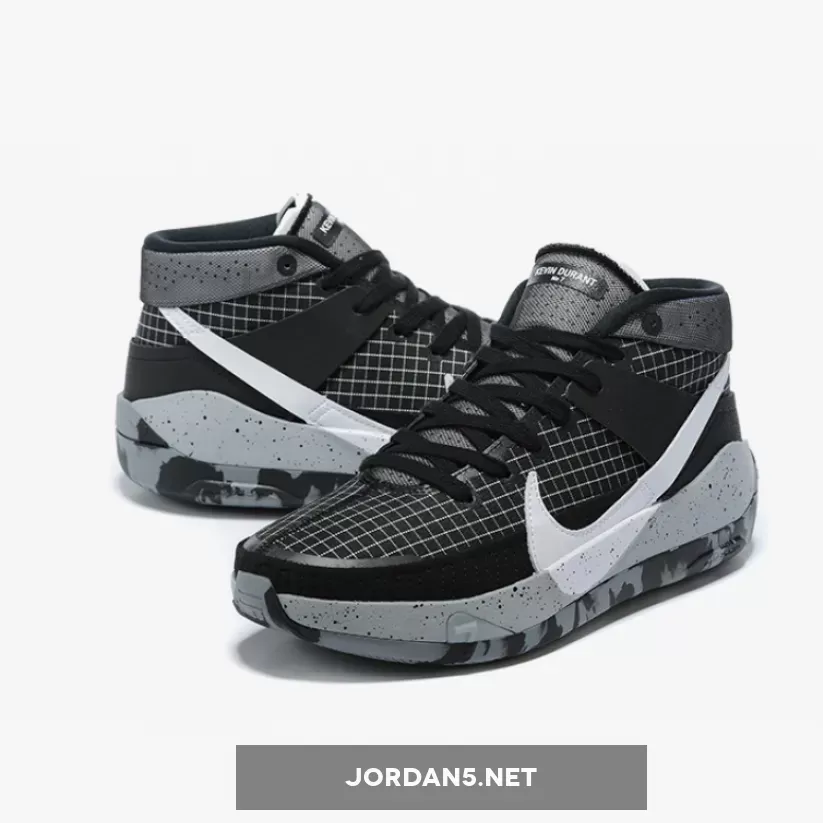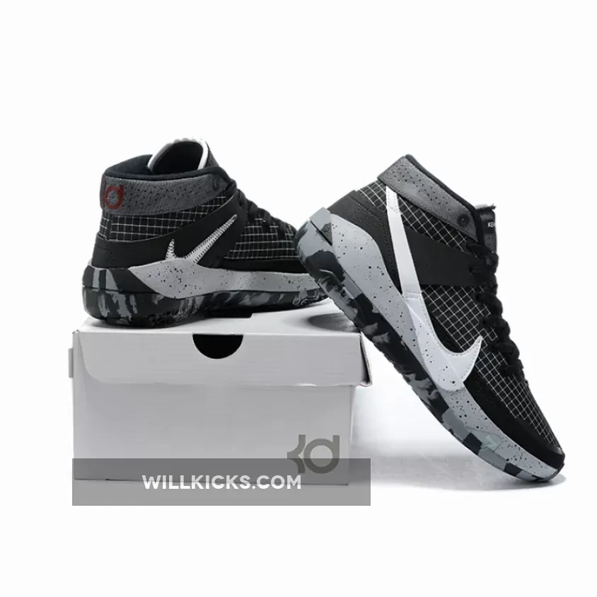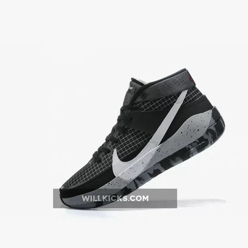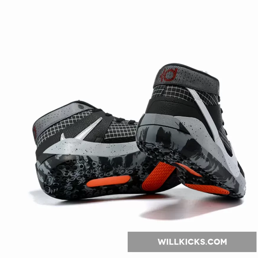 this Nike KD 13 features Black across the base while highlighted with a grid pattern. Following we have White on the leather Swoosh logos across the sides, Orange lands on the heel branding, insoles and outsole. Combining Black and Grey on the midsole which has an Ore theme while a camouflage like outsole finishes the look.