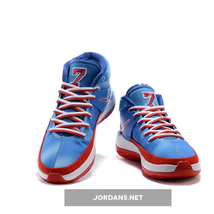 Dressed in a University Blue, University Red, and White color combination. This Nike KD 13 comes highlighted with a smooth upper that mainly uses Blue. However, it comes with White areas that give it a unique tie-dye look. Following, Durant’s number ‘7’ lands on the tongue in Red while the same shade wraps the entire shoe with a stitch pattern. On the White midsole is a small blue area with his number 7, and Red covers the large Swoosh. Lastly, branding covers the insoles, and Red runs across the rubber outsole.