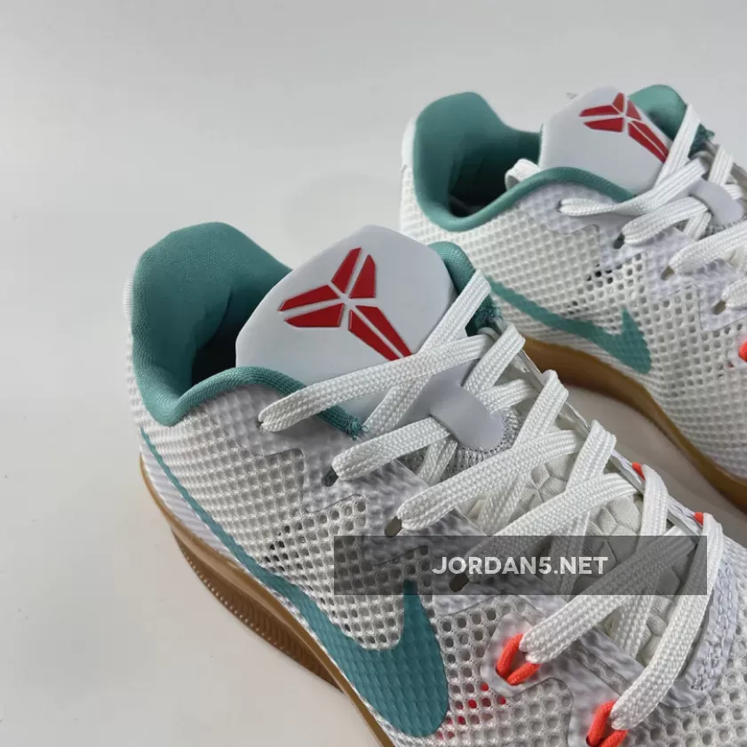 The Nike Kobe 11 EM Low ‘Summer’ features a colorway that hints at the colors of the country where Kobe Bryant grew up—Italy. The white engineered mesh upper has hits of green—albeit in an aqua tone that deviates from the traditional Italian version—on the Swoosh and collar, while an orange-red peeks out on the branding and lace loops. Below, the midsole-outsole comes in a gum rubber that wraps up the side for extra support.