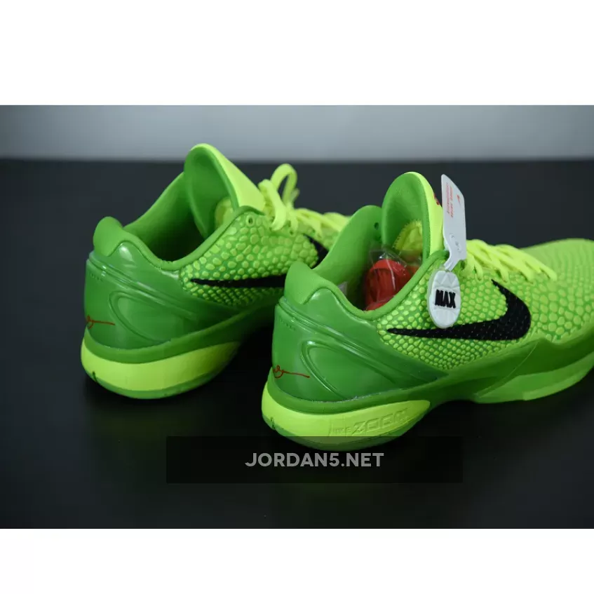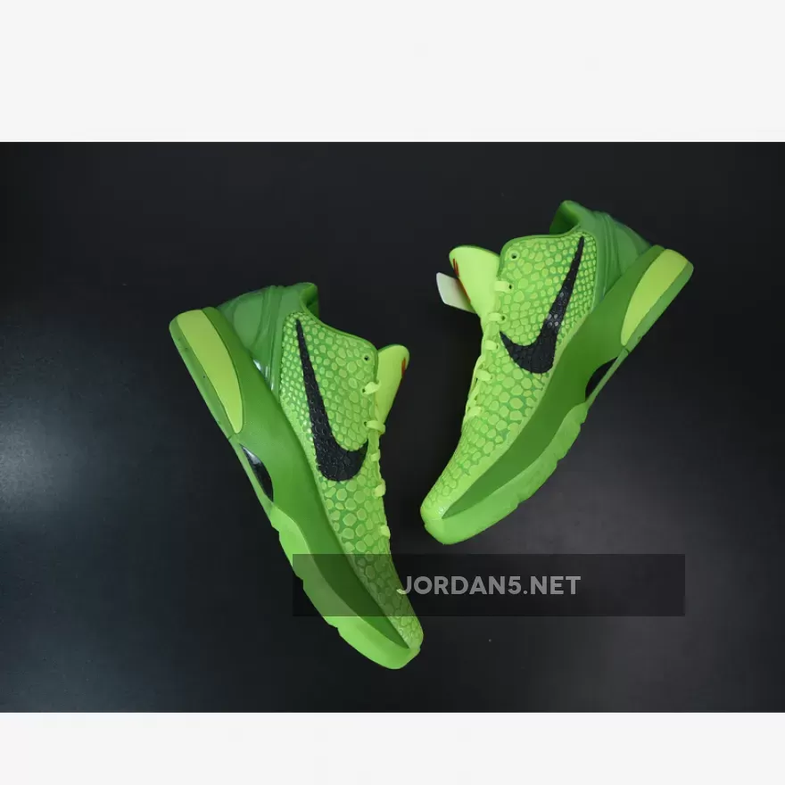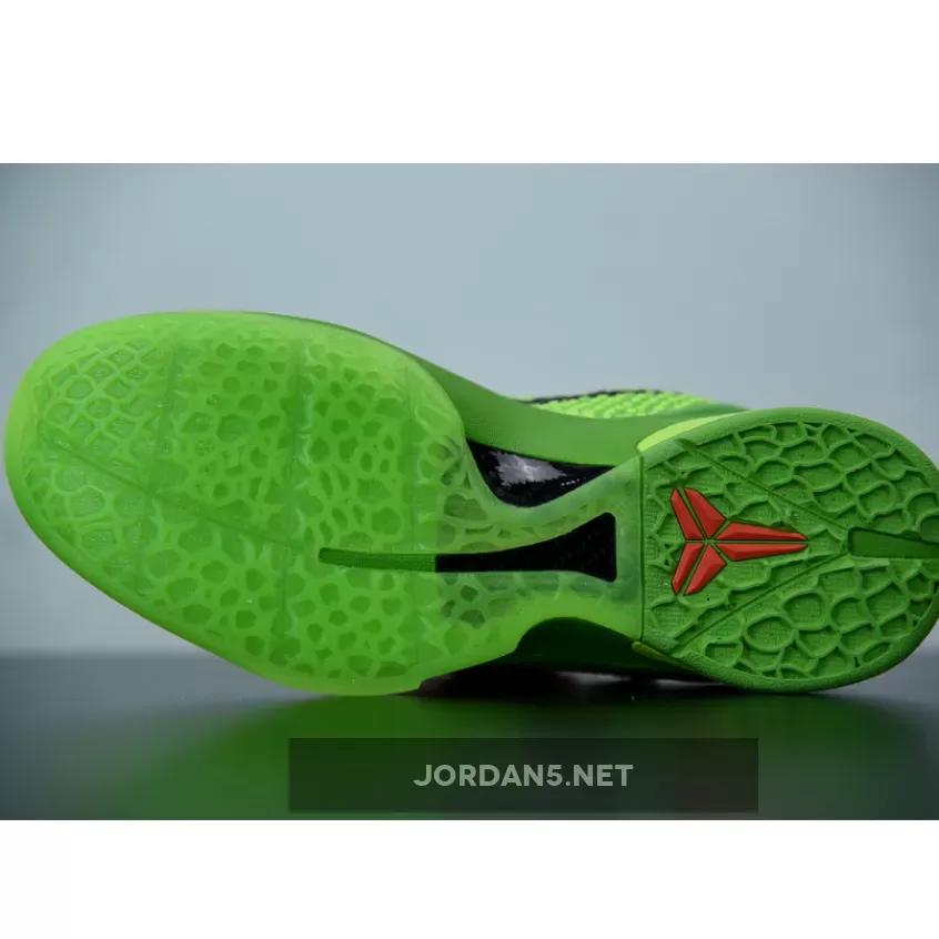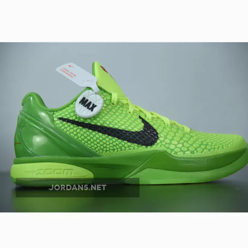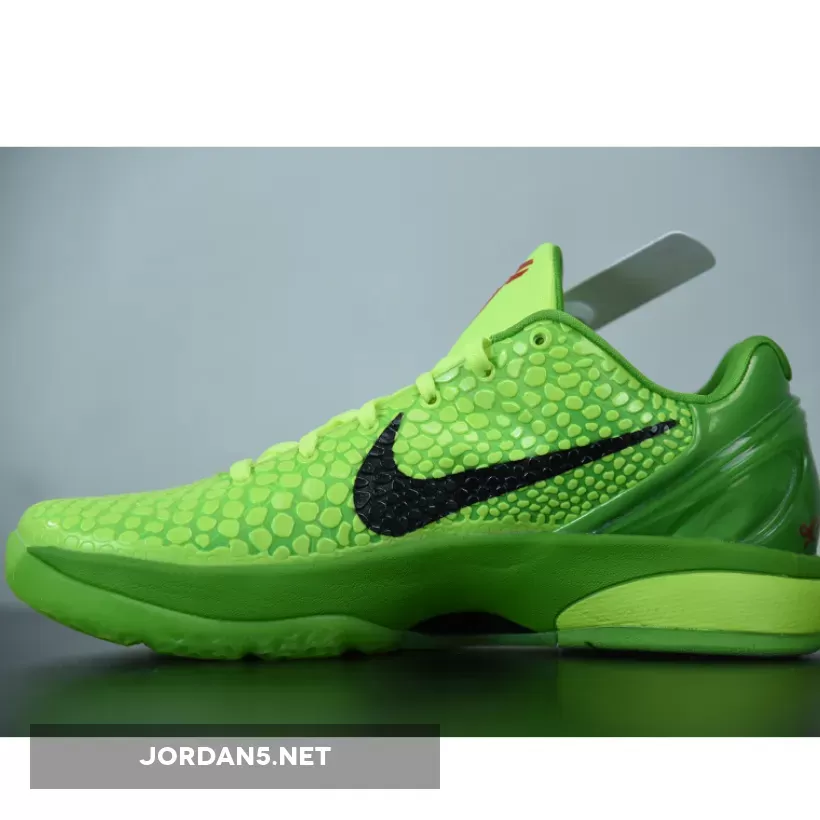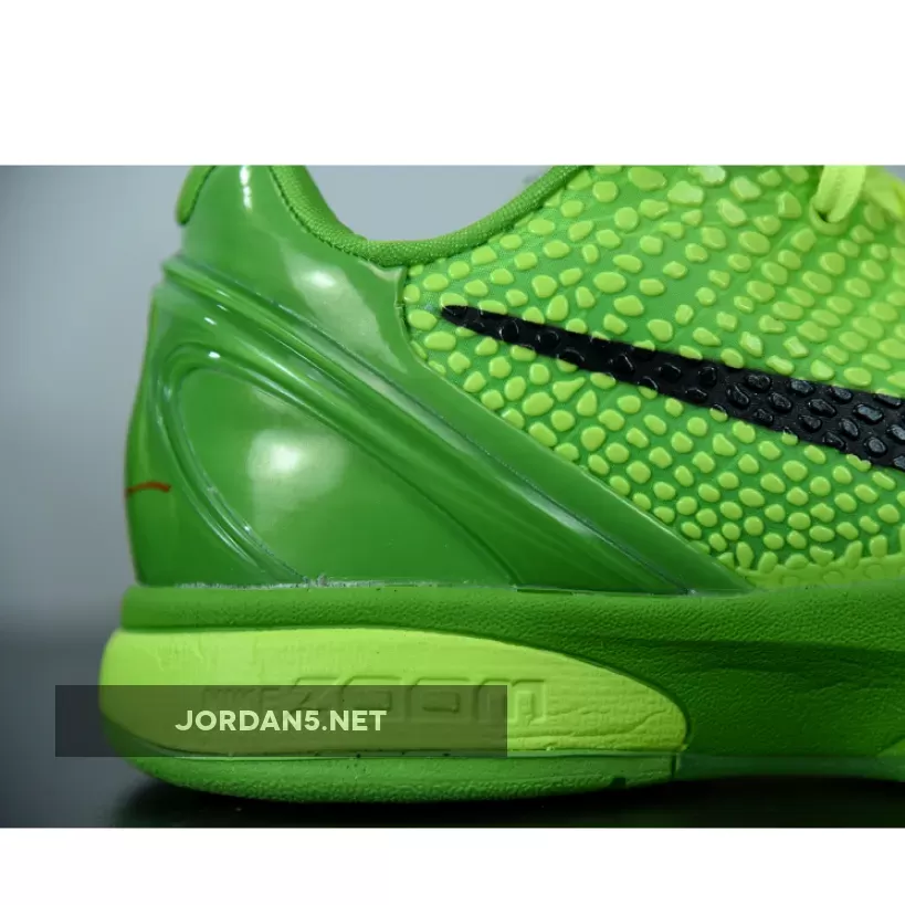 Firstly, the Grinch esque palette wears nothing but a vibrant shade of green as its base. The neoprene tongue tab, synthetic heel panel at the back, and the Kobe basketball midsole everything flaunts the same shade of green all over.