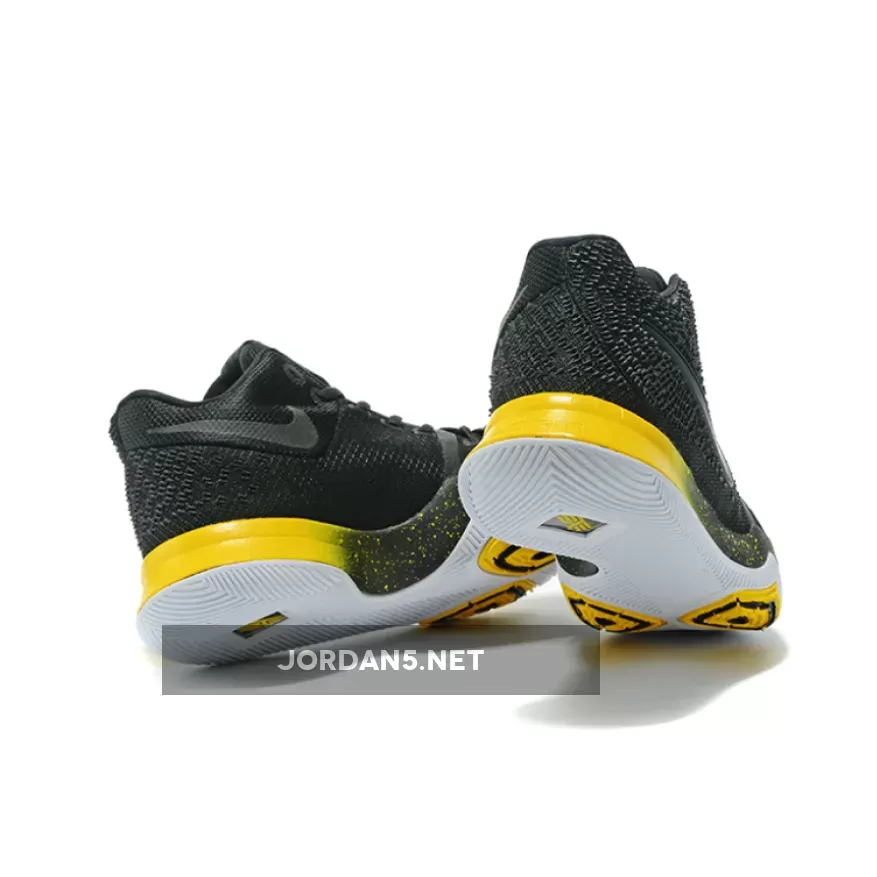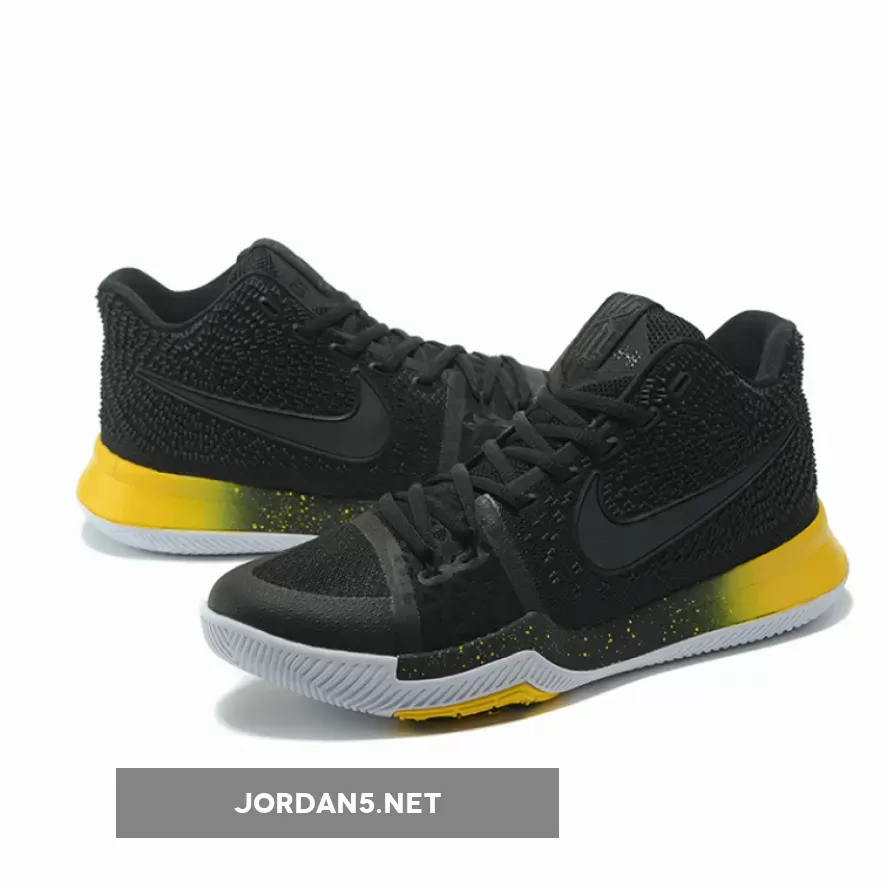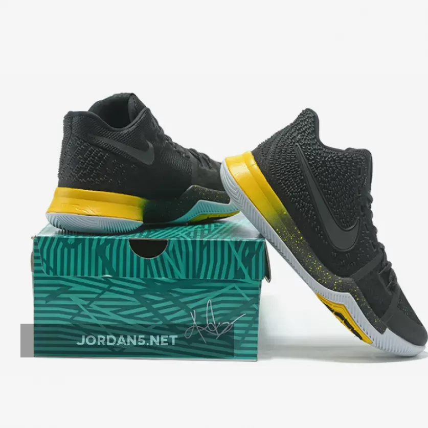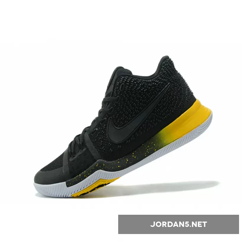 Covered in Black throughout the entire upper, this Nike Kyrie 3 is contrasted with hits of yellow on the back of the midsole, as well as via the speckling that also appears on the midsole.