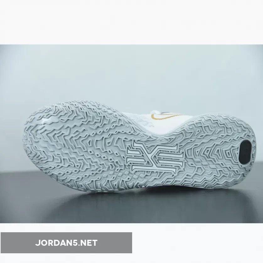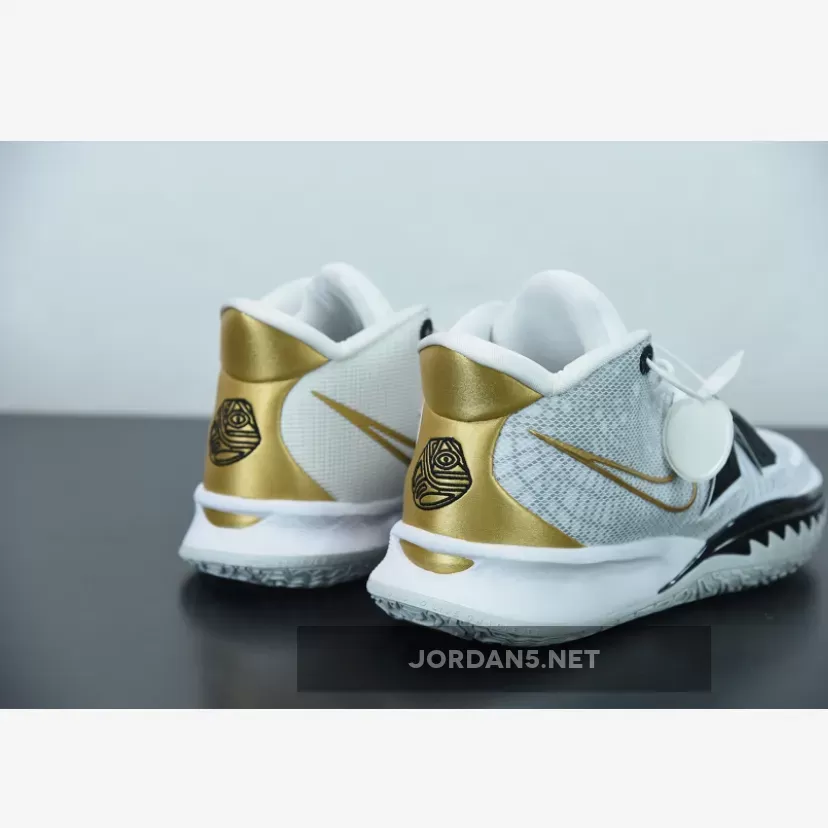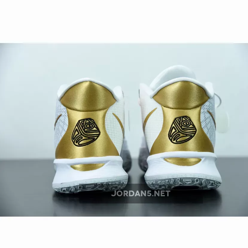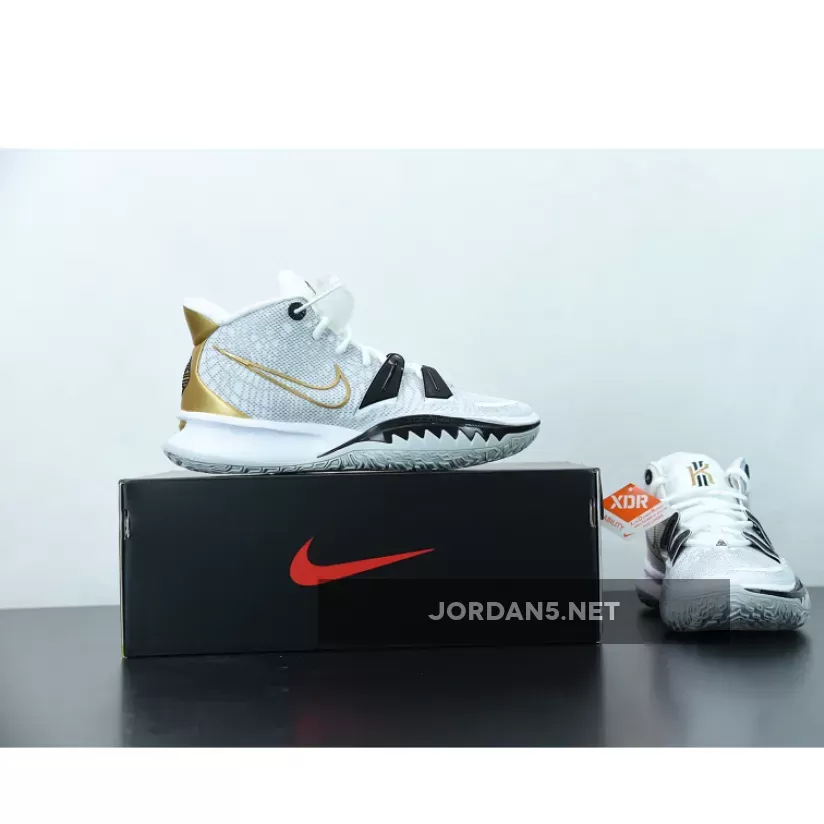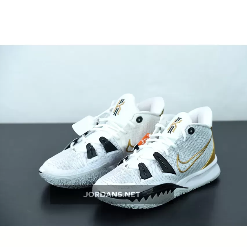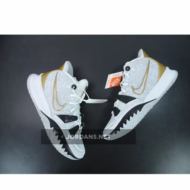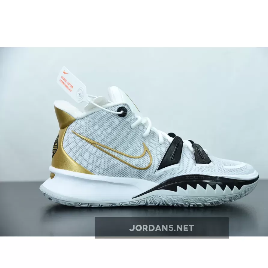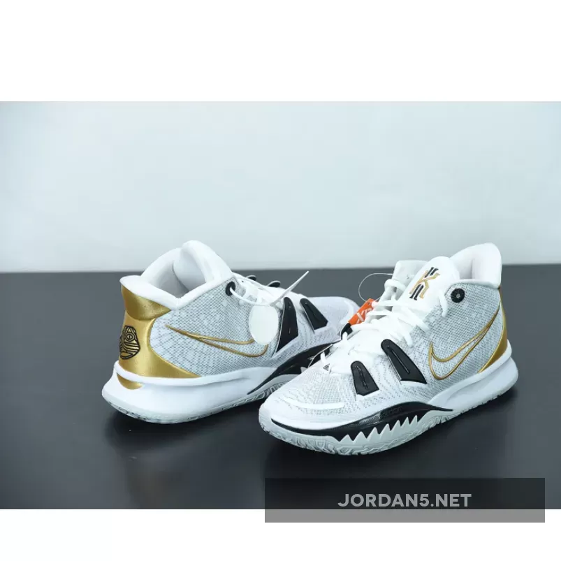 Dressed in an elegant White, Black, and Metallic Gold color scheme. This Nike Kyrie 7 features a White textile upper paired with Black detailing throughout and Metallic Gold covering the Swooshes, tongues, heels, and insole branding. Highlighting the shoe is an NBA ring on the heels to complete the design.