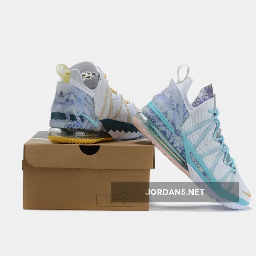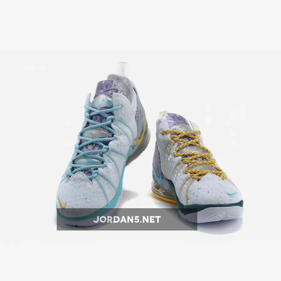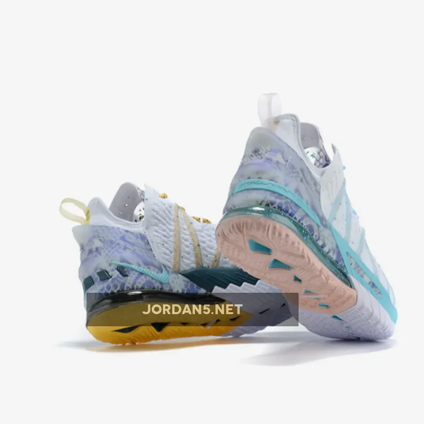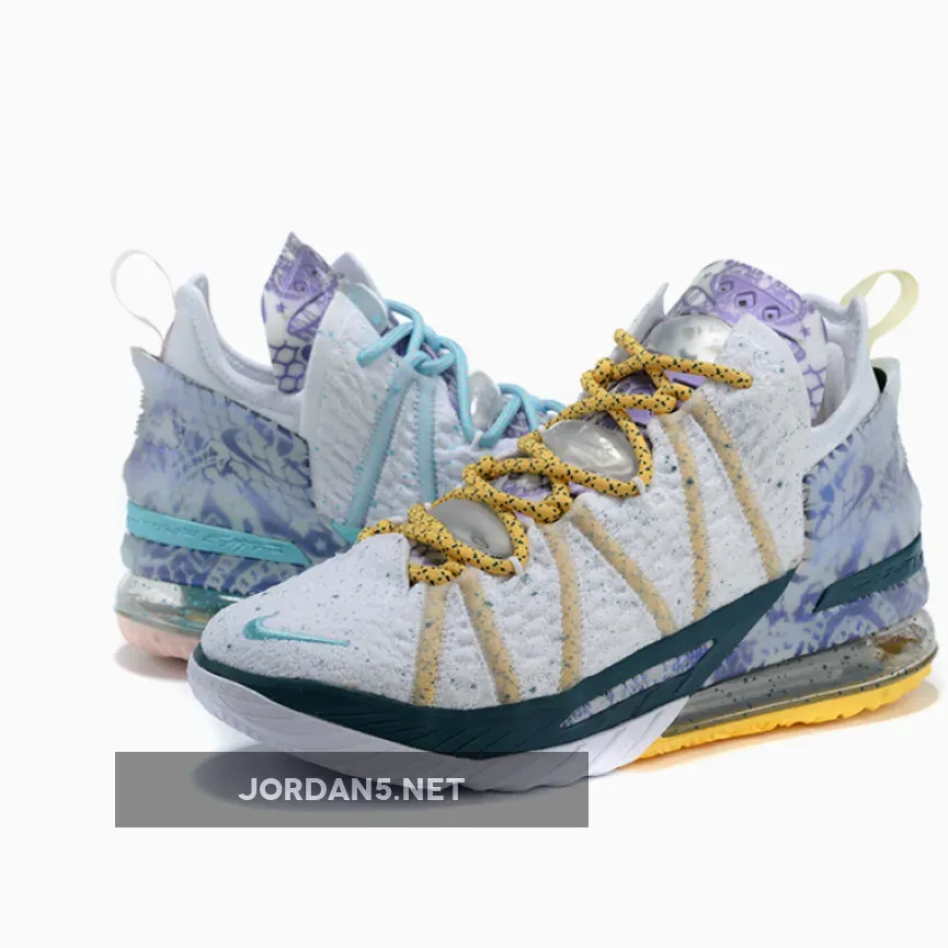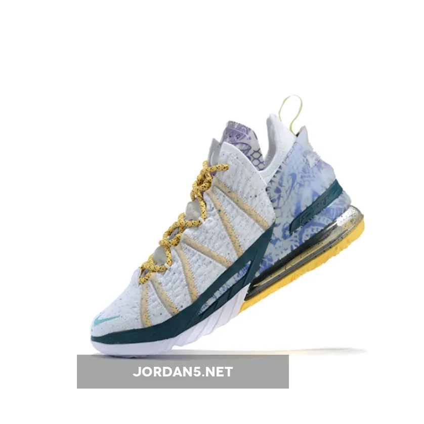 The reflection theme is expressed through slightly altered colors on the left and right shoe, with variations on the sole, logos, heel tab and laces. Iconography representing his 17 seasons to date creates unique collages that appear as graphics on the heel, tongue and sockliner. With a lightweight White Knitposite 2.0 upper, durable molded heel clip, new Air system in the tongue and a full-length Air Zoom unit combined with a Max AIR unit in the heel, this game-changing design elevates the LeBron signature line to the next level.