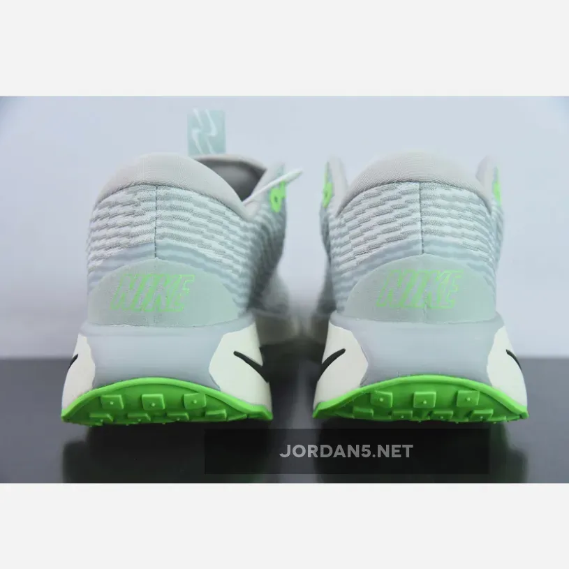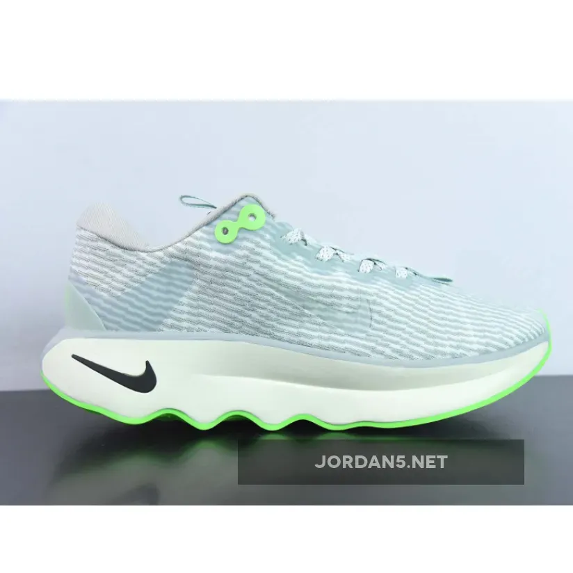 This Motiva starts out with a breathable light silver grey upper with icy semi-translucent TPU signature profile Swooshes embedded on both the medial and lateral mid-panels. The soft foam waterfall collar in grey hugs around the ankle and heel for comfort and a frictionless inner sleeve makes it easy to put on and pull off. A coconut milk-coloured midsole and a green strike rubber outsole featuring uniquely patterned outsole and an exaggerated rocker design round out the look of these kicks.