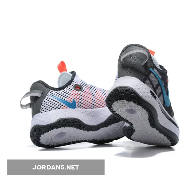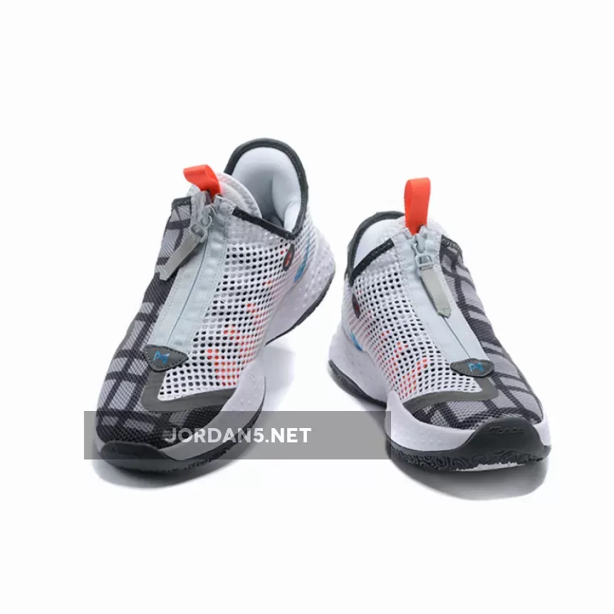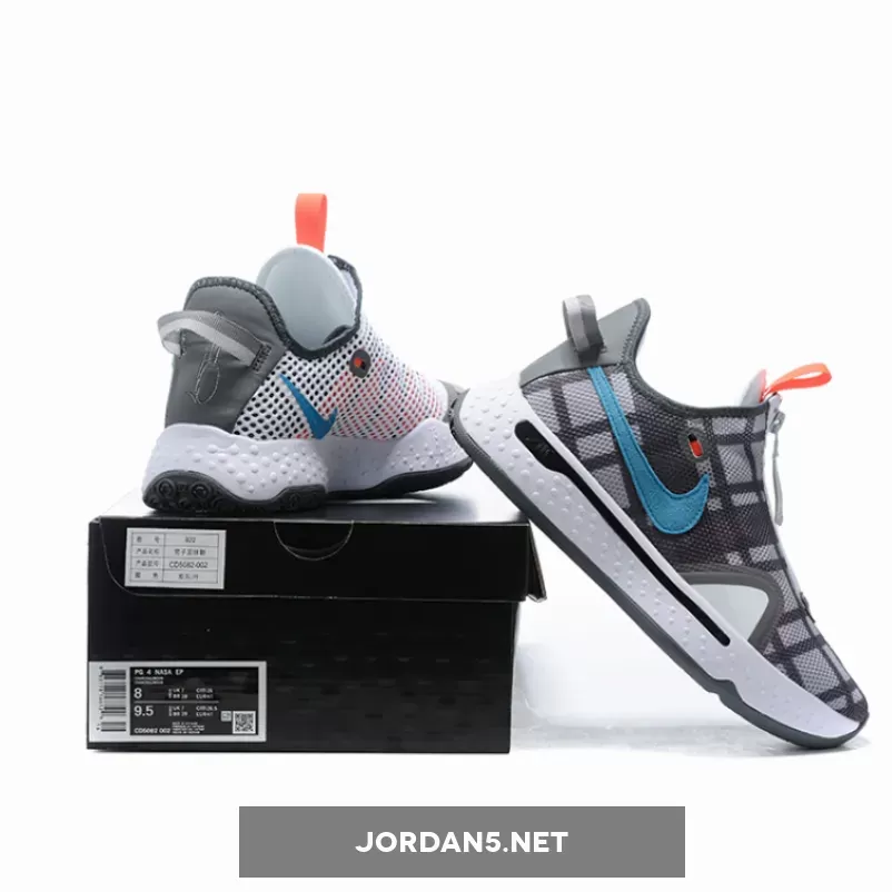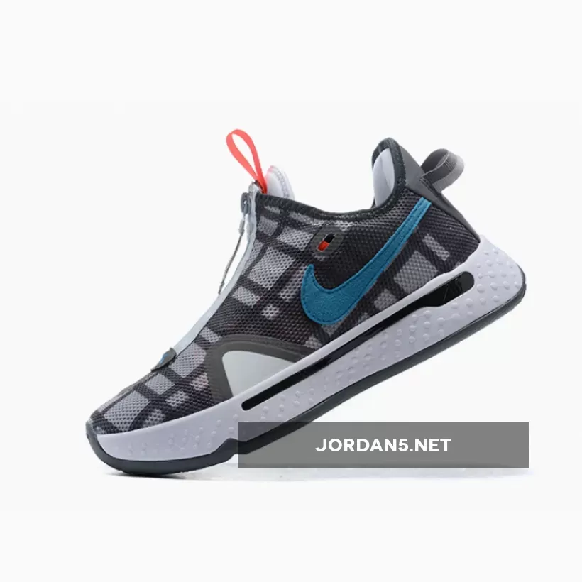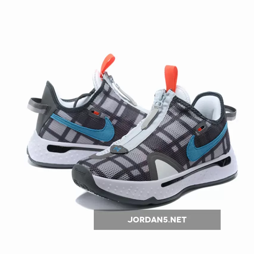 Dressed in a Football Grey, Laser Blue, and Light Smoke Grey color scheme. This PG 4 features a Grey plaid upper contrasted with White on the medial mesh side panel, Orange covering the pull tabs and lockdown cables as well as Blue Swooshes on the sides. A White foam midsole atop a dark and light Grey rubber outsole completes the design.