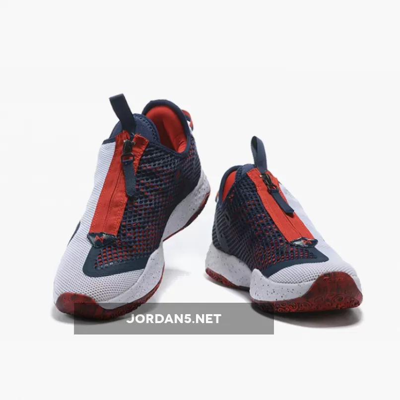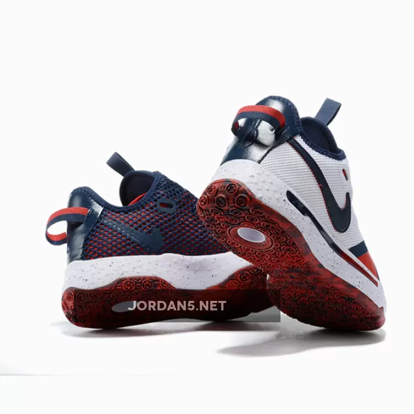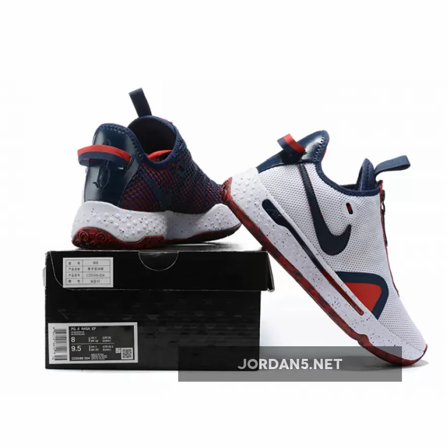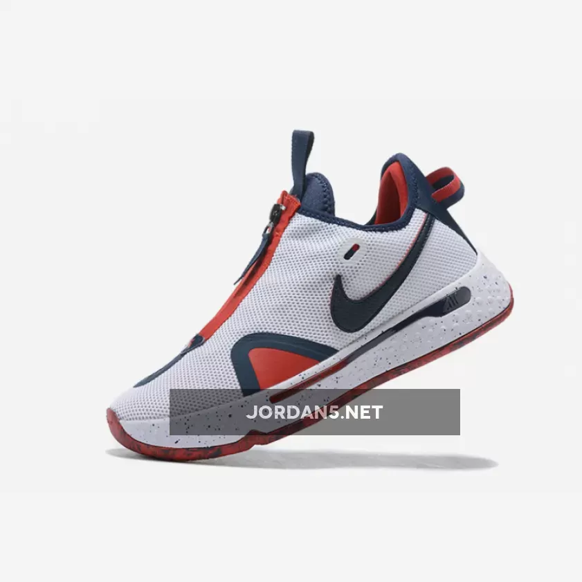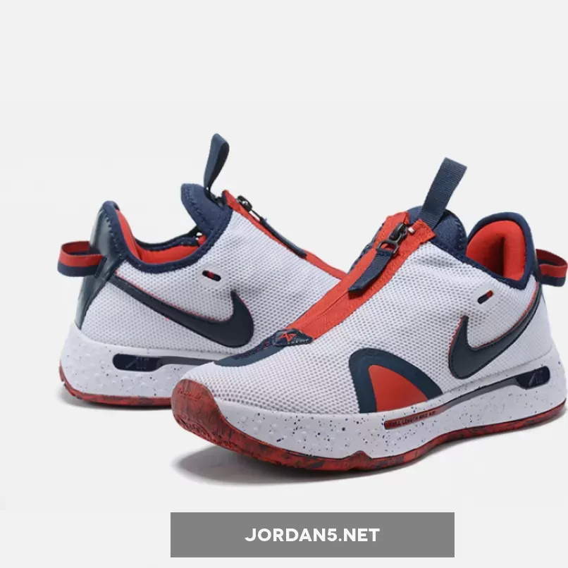 This offering of the Nike PG 4 features a White mesh upper paired with a semi-translucent Navy panel on the medial side, while Red accents covers the zipper, midfoot and sock liner. A speckled midsole atop a Red/Blue marbled outsole completes the design.