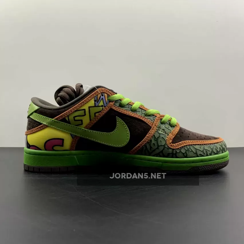 The Nike SB Dunk Low ‘De La Soul’ is a low-top remix of the 2005 high-top colorway designed in collaboration with alt-rap trio De La Soul. The design features a Baroque Brown suede upper with Altitude Green elephant print and vinyl graphic overlays inspired by the cover of their debut album 3 Feet High and Rising. Released in May 2015, the sneaker also comes with a green midsole and brown outsole.