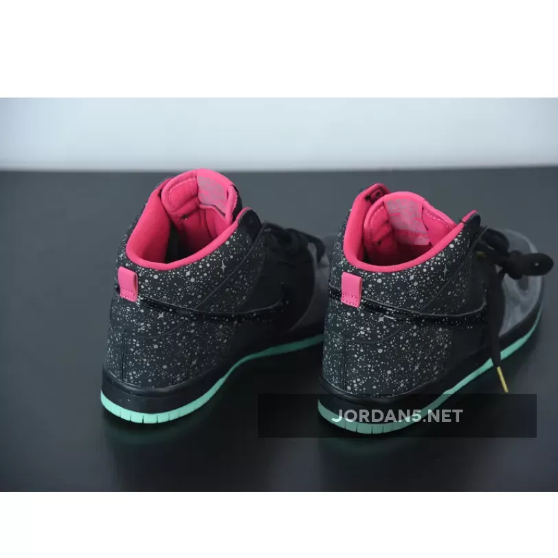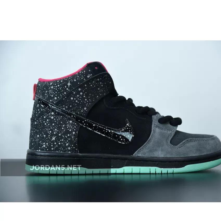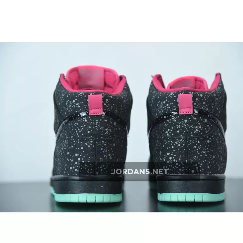 The upper of the Dunk SB High Premier Northern Lights features a mix of synthetic materials and suede, with a black color scheme and a Hyper Pink collar and heel tag. The sneaker has stars located on the heel and on the Nike Swooshes. They are crafted in a reflective 3M material and are arranged in a constellation-like pattern. The shoe is built with Nikes innovative Zoom Air cushioning technology, which provides responsive and comfortable support for everyday wear or high-intensity activities.