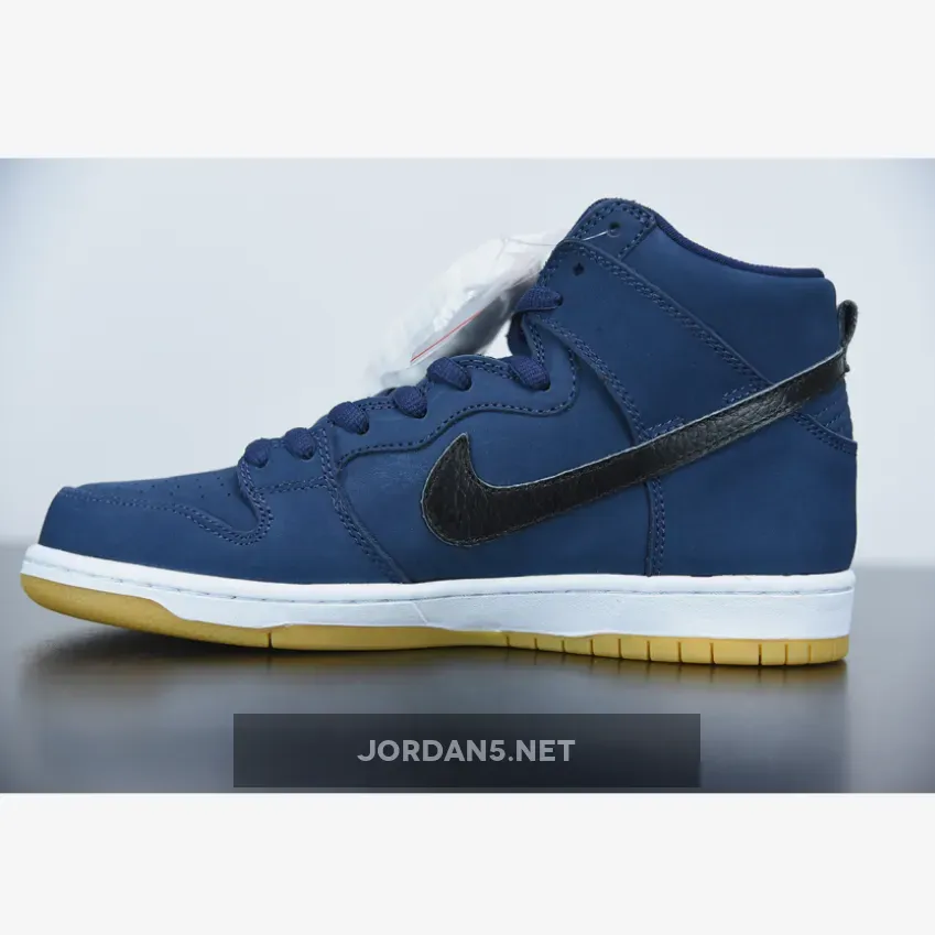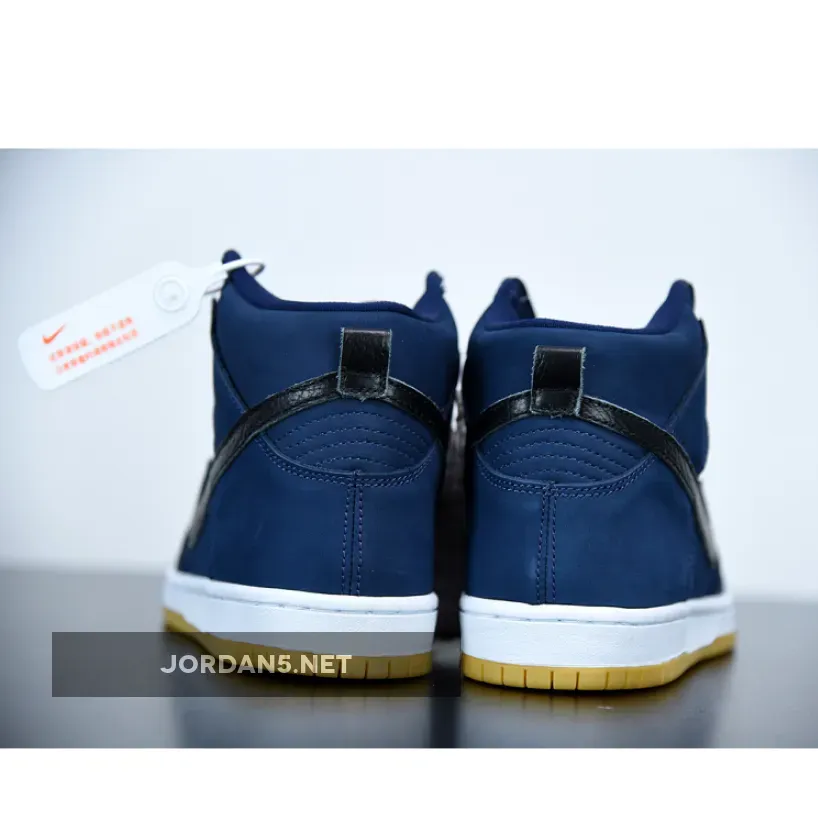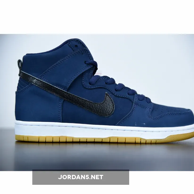 Black laces and leather side swooshes interrupt the navy scheme that takes over the rest of the upper. Underfoot, sole units indulge in a tried-and-proven white midsole/light gum brown outsole combination, which also appeared on the low-top SB Dunk. As is customary of these skateshop-exclusive shoes, the label on the tongue should don orange branding.
