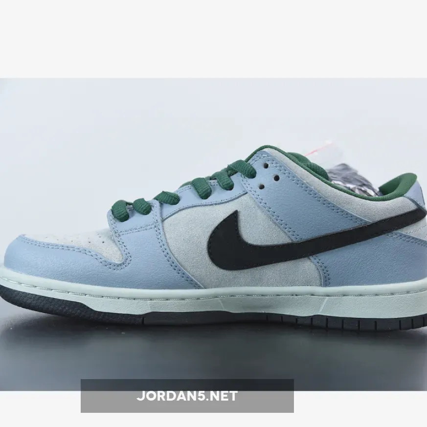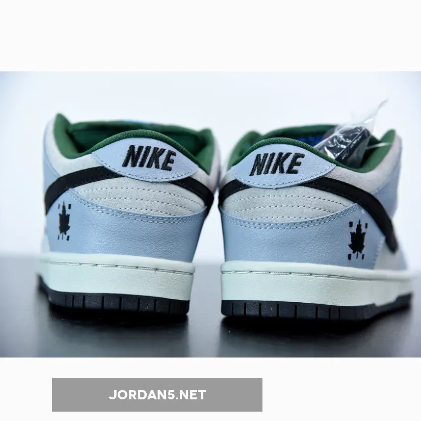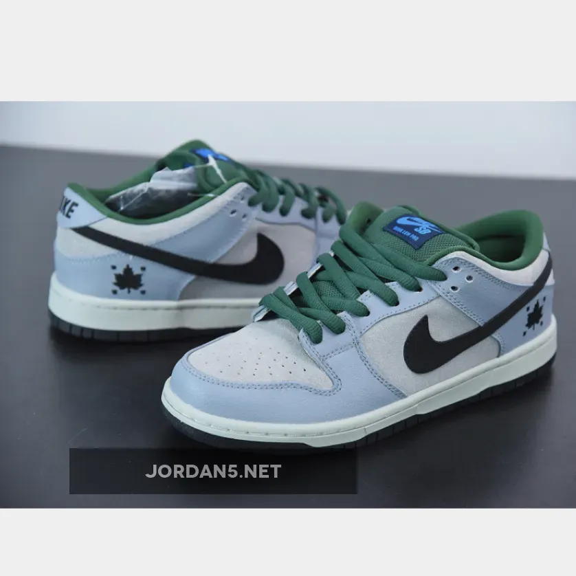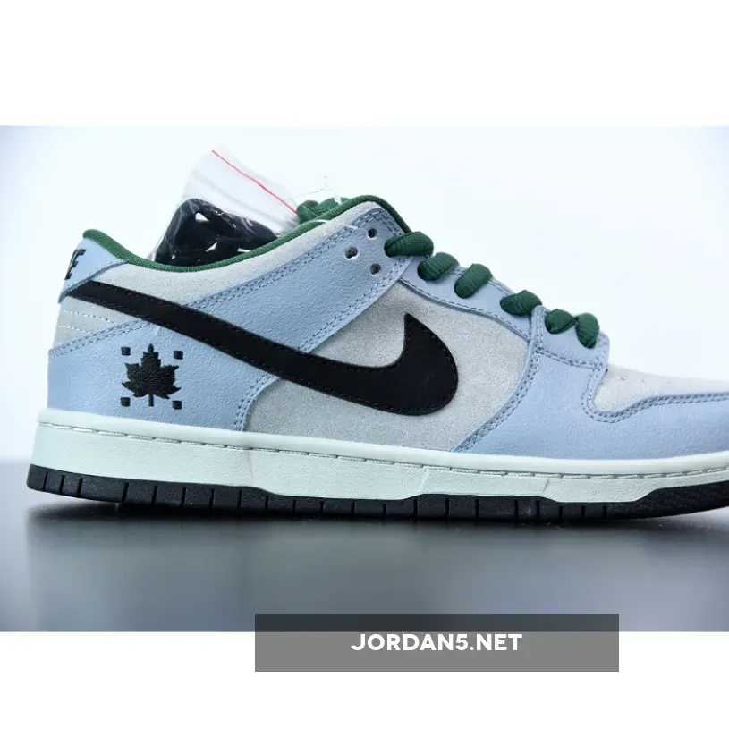 This Nike SB Dunk Low features a Dove Grey suede upper with Black detailing, minor hints of Blue on the tongue and Gorge Green accents. The shoe is also completed with a Maple Leaf embroidery on the heel.