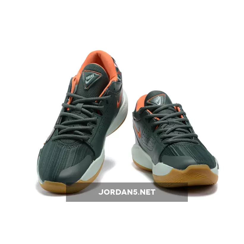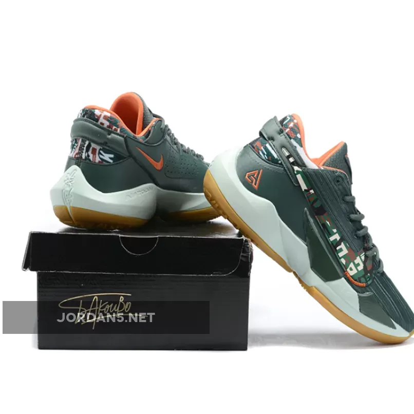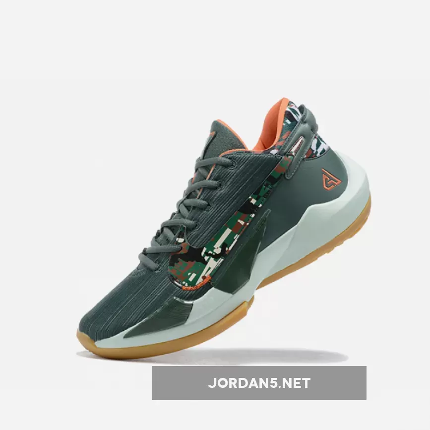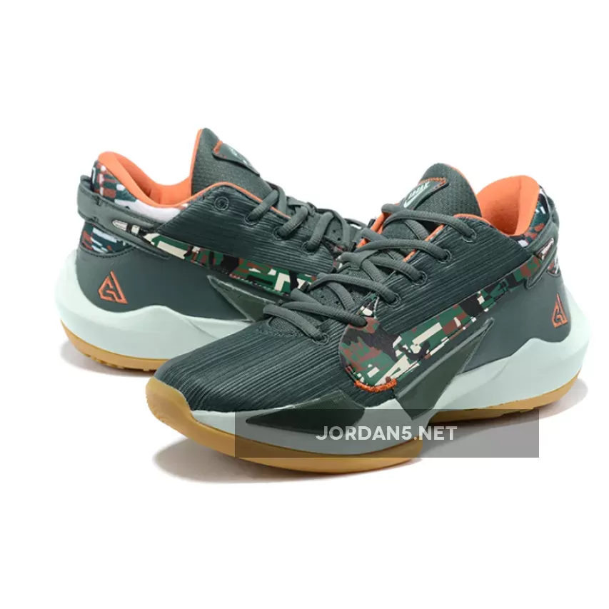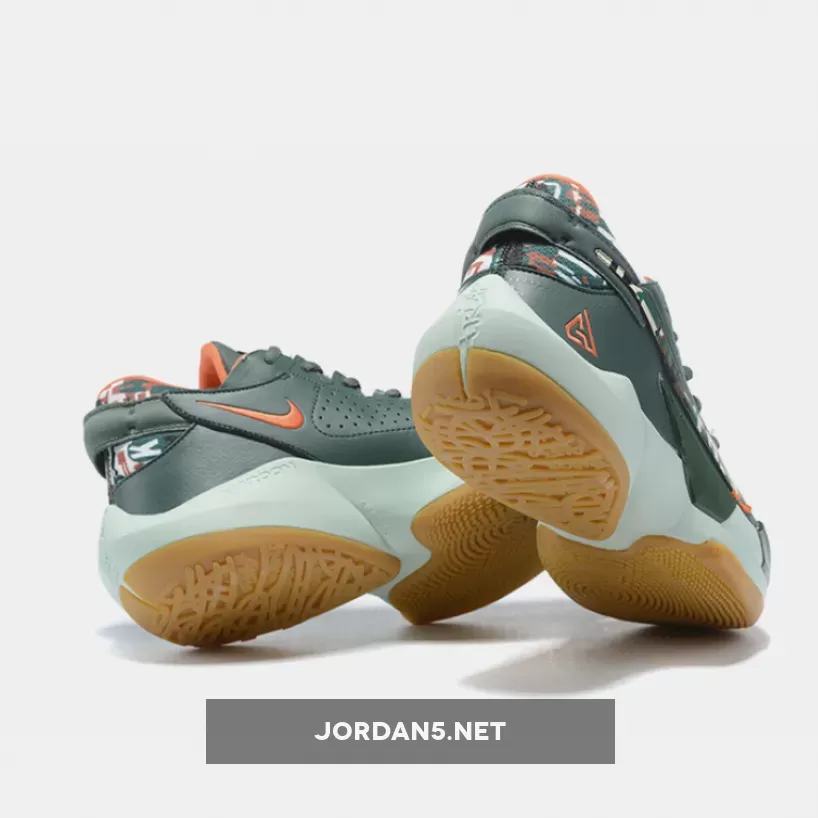This offering of the Nike Zoom Freak 2 features a Vintage Green mesh upper with leather in the rear. Camouflage print covers the Swooshes and heel while having pops of Orange on the inner lining and signature “GA” heel logo. A White midsole atop a Gum rubber outsole completes the design.
