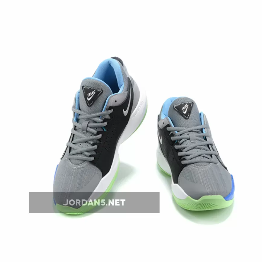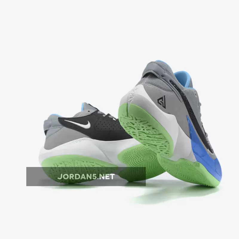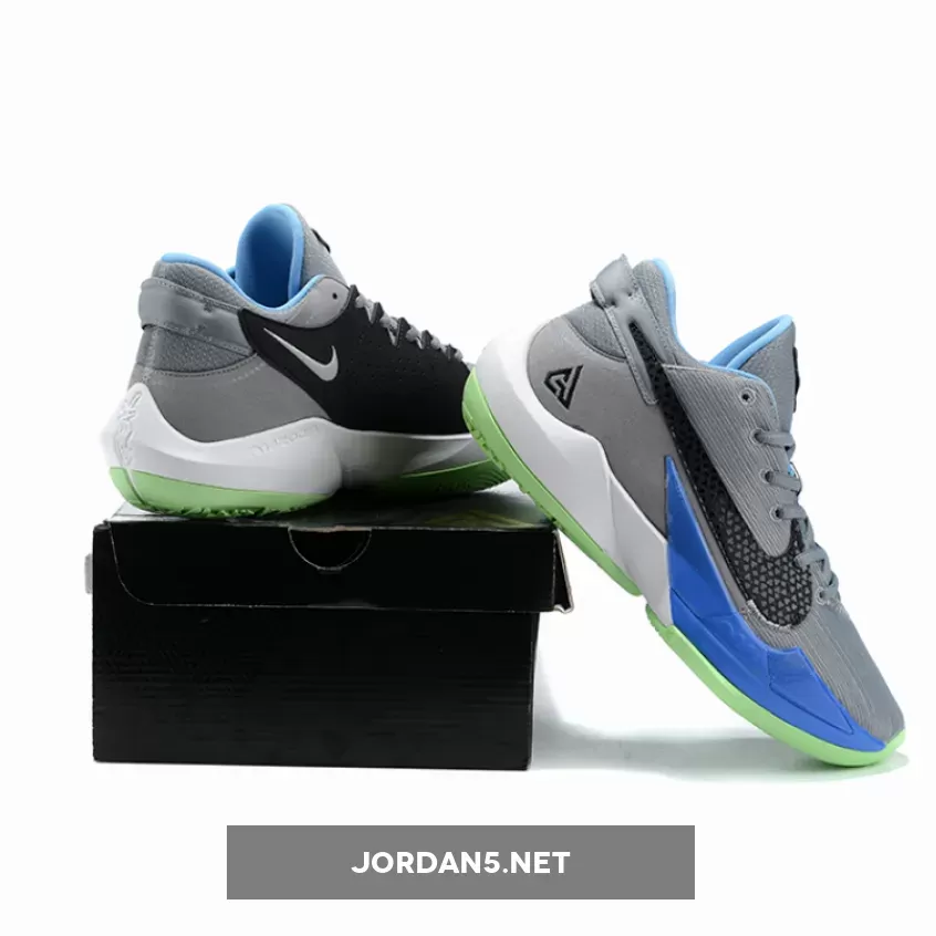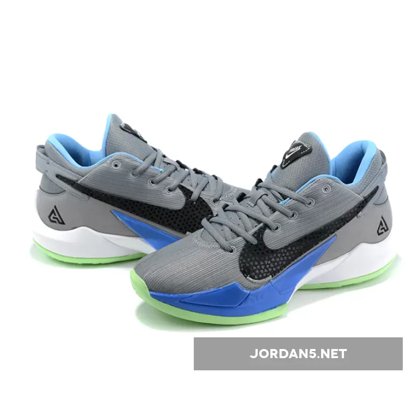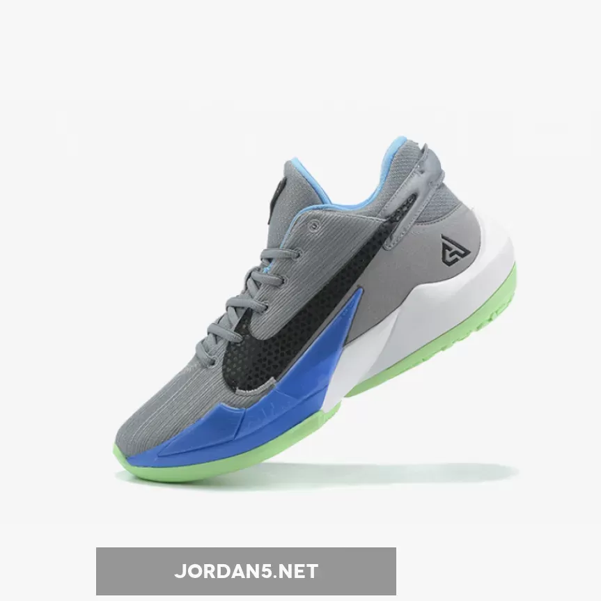 Dressed in a Particle Grey, Black, Blue Beyond, and Sail color scheme. This Nike Zoom Freak 2 features a Grey-based upper with Black covering the medial side. A Black lateral Swoosh covered in spades, diamonds, hearts, and clubs, Blue contrasting accents atop a White midsole and Green rubber outsole completes the design.
