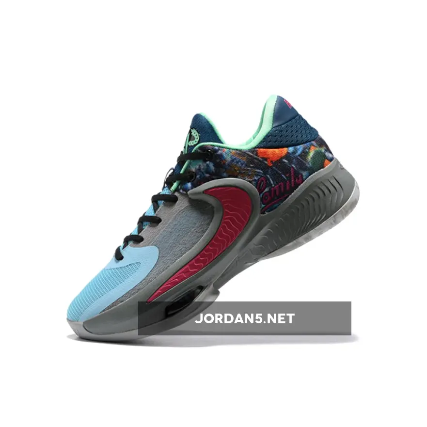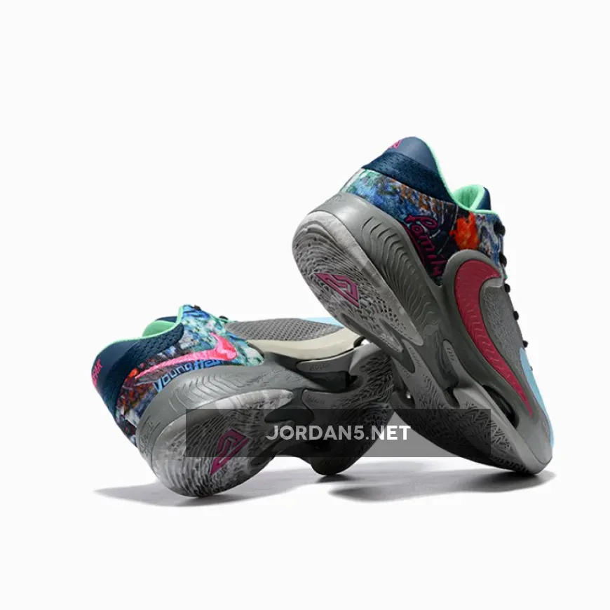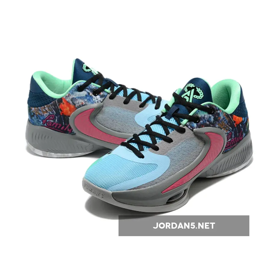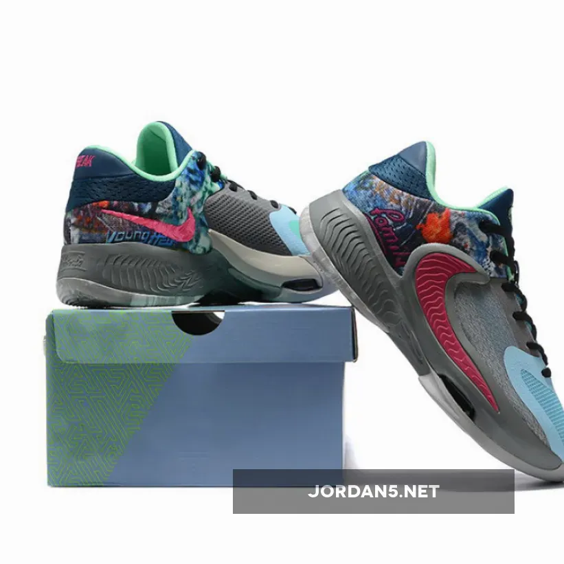 The father of two and second-oldest brother in a family of seven has always paid tribute to both the sacrifices and upstanding character of his household by way of his signature line with Nike. The latest colorway of the Zoom Freak 4 “Family” follows suit in the familial tree of silhouettes. A dark gray takes hold in the central portion of the model in the ribbed midsole and a thin layer of protective mesh that lies above a vibrant baby blue accent. The former’s bright tone is mirrored on the forefoot panel while a turquoise accents the sock-liner and vamp overlays with the palette of blues being extended as navy fills the upper heel counter and tongue construction. Amidst an already loudly toned ensemble, the heel counter offers multi-color graffiti style collage including “family” and “young HEIR” inscribed just above the medial midsole with both the lateral and interior Swooshes opting for a hot pink treatment.