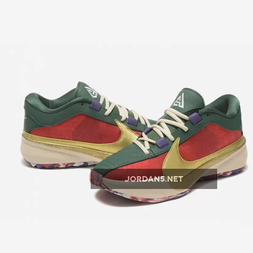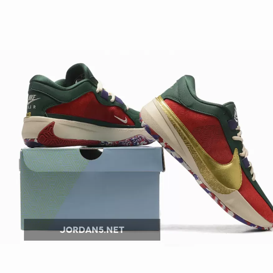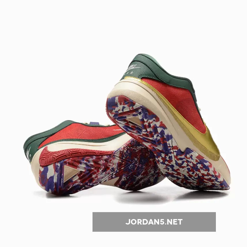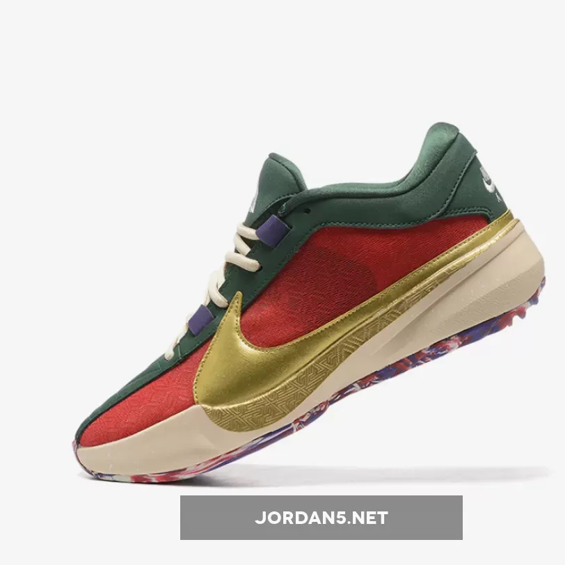The Nike Zoom Freak 5 is quite a sizable departure from its predecessors in terms of design, forgoing the backwards Swoosh that’s dressed almost every model. Instead, a Swoosh double its size is in its place, sitting just between the upper and midsole. The silhouette appears to be much more streamlined in its construction, forgoing the visible signature Air Unit on the sole. The first shoe appears to arrive in a gym red and metallic gold colorway. The shoe’s heel, tongue, and center of the upper is covered in a deep green, while the shoe sits atop a tri-color outsole to round off the design.the sole unit, too, is similarly simple, forgoing the visible Air Unit signature to the Zoom Freak 4.