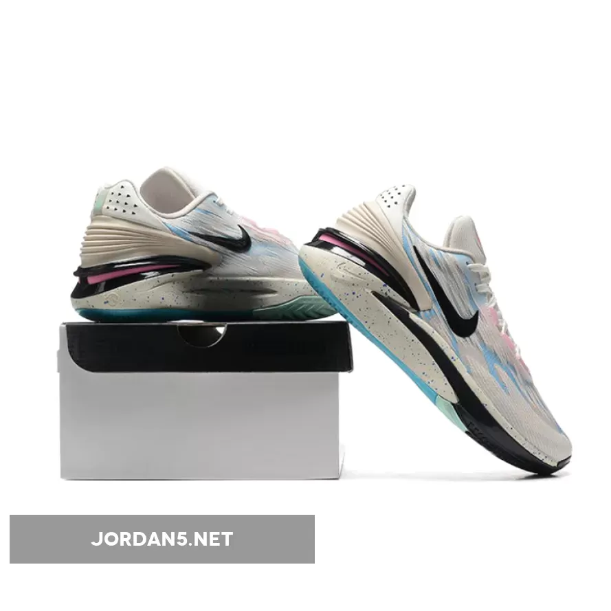 Written across the tongue alongside a thematically complementary graphic, the above text stands above a bright, Spring-appropriate take on the Nike Zoom GT Cut 2. Though it may start with a white base, the pair incorporates many a loud hue, subtly conjuring to mind images of South Beach with its light pinks and blues. These appear along the weave of the upper, the eyelets, and even the sole and heel, taking shine away from the blacked-out finish of the fixtures immediately adjacent.