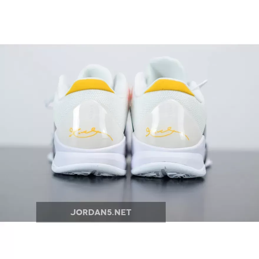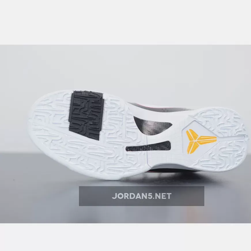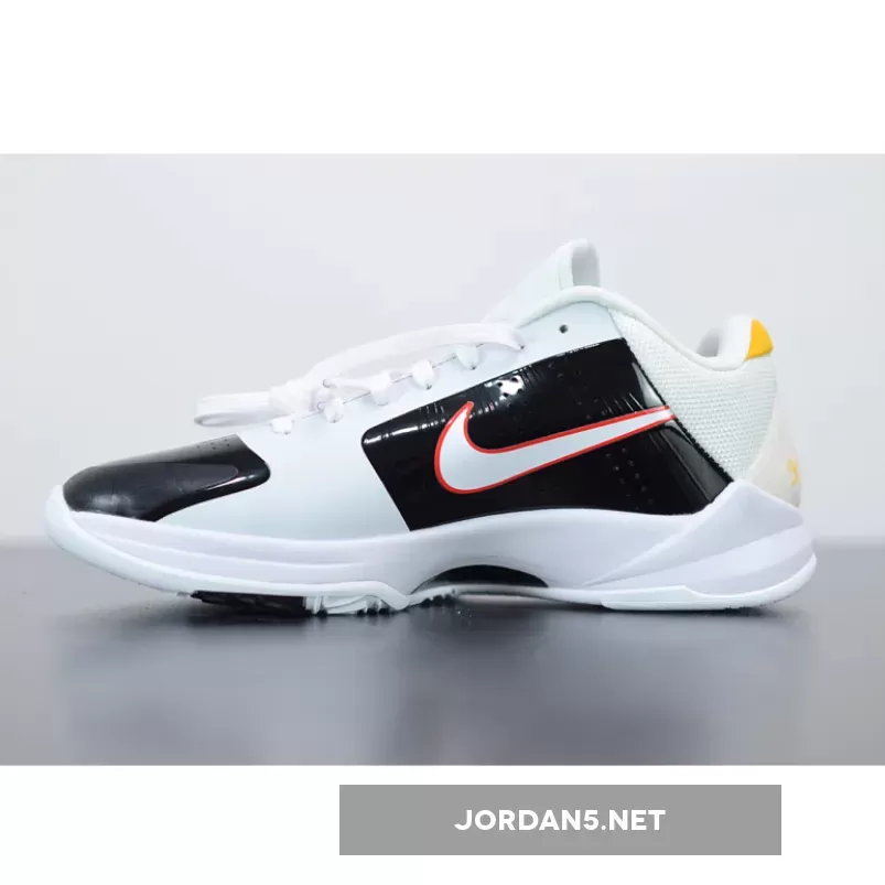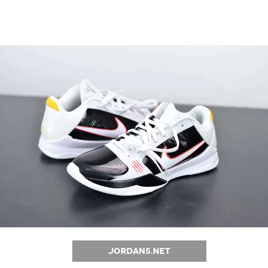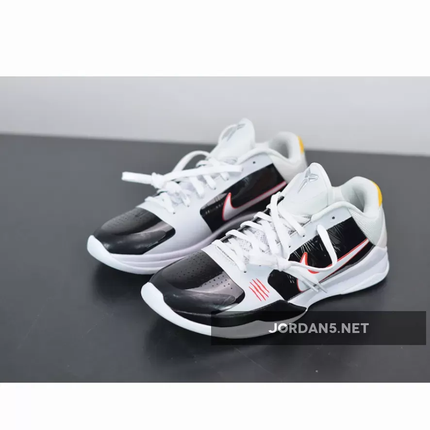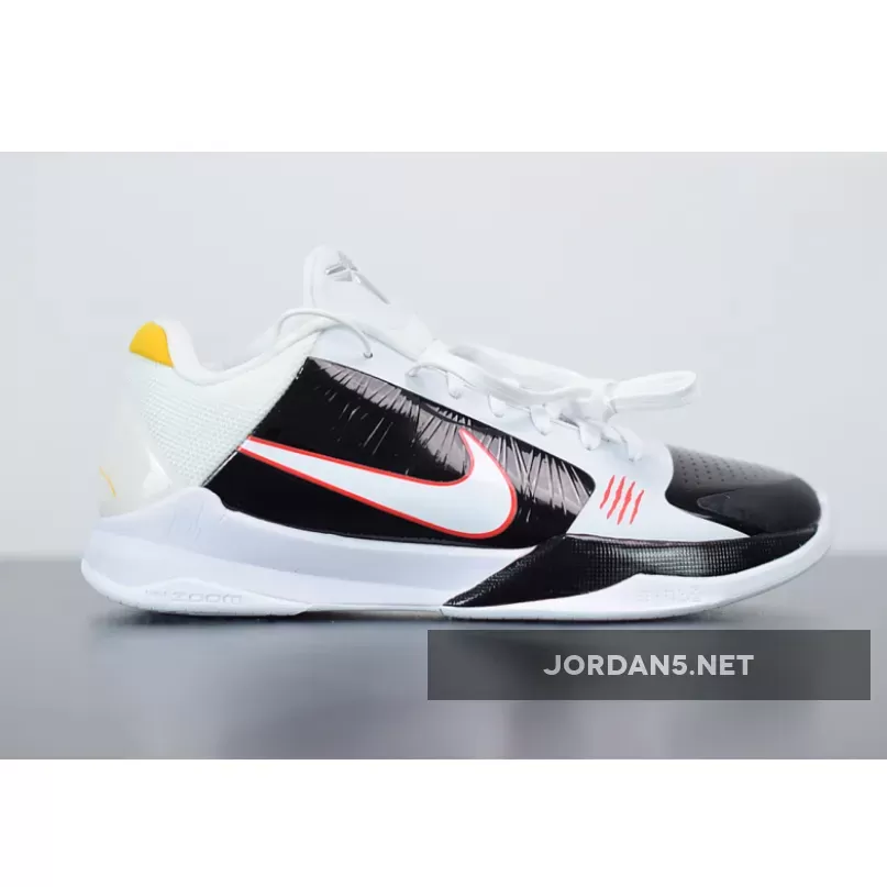 The Nike Kobe 5 Protro Bruce Lee Alternate Men's shoe with SKU CD4991-101 is a black and white take on the original. The upper is made up of black and white paneling, while hits of red can be seen outlining the Swoosh and on the lateral side scratch marks, tributing Enter the Dragon. A white and black Zoom sole, yellow heel cushioning, and silver Kobe branding on the tongue completes this alternate design. The shoe is inspired by Bruce Lee and is a second Bruce Lee inspired colorway of Kobe Bryant’s fifth signature performance basketball shoe with Nike.