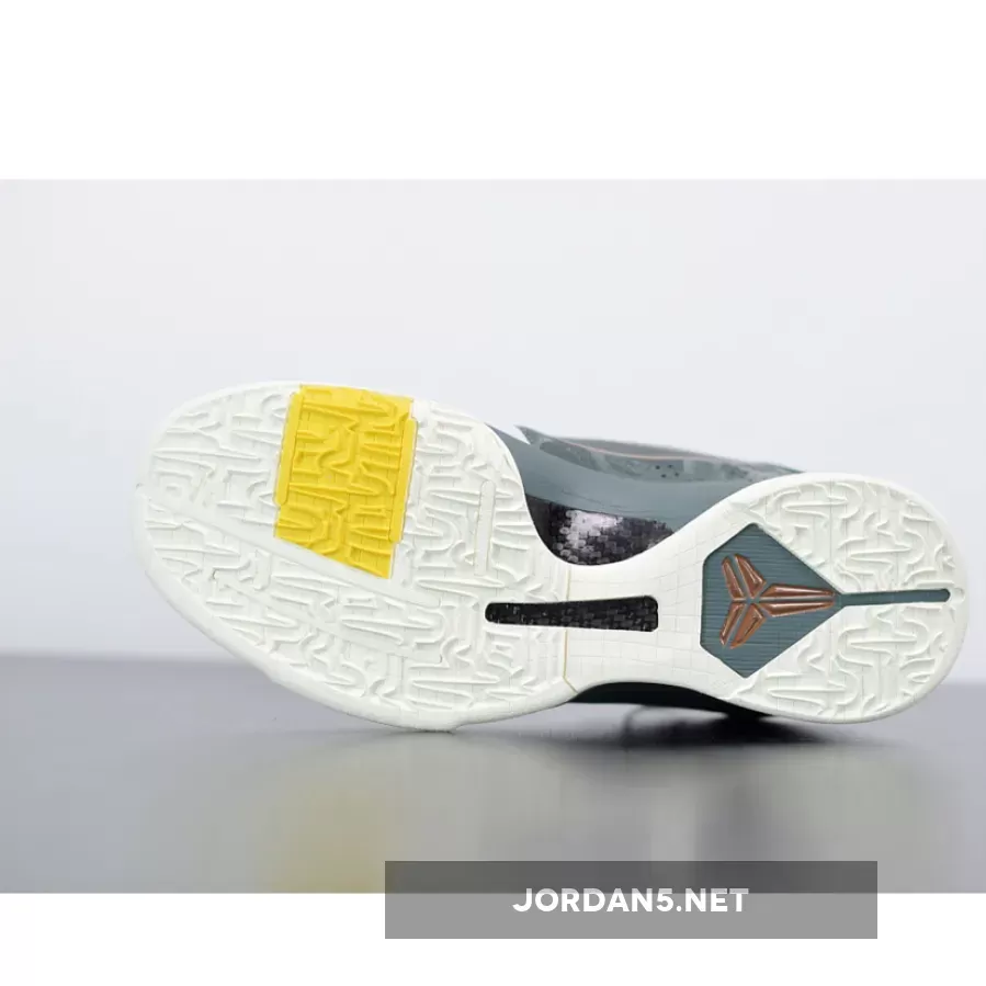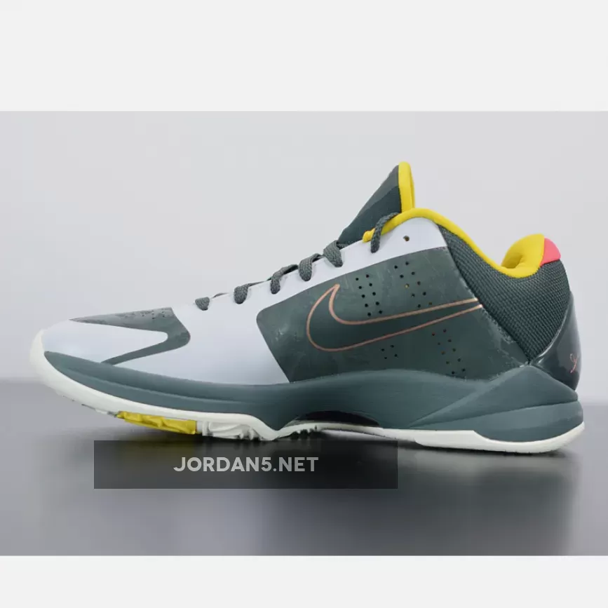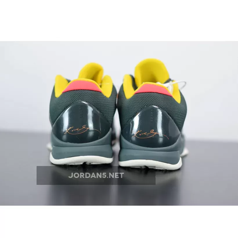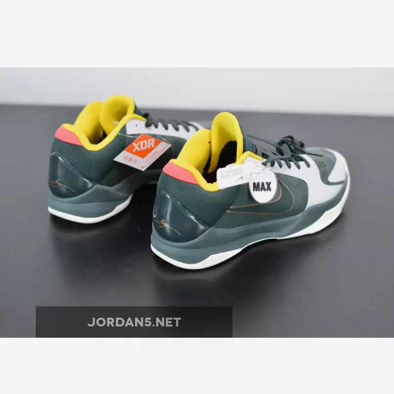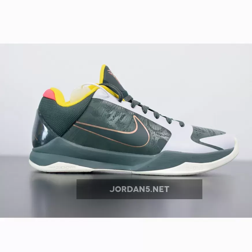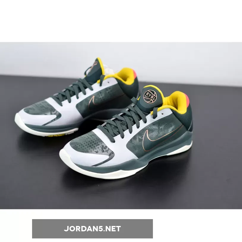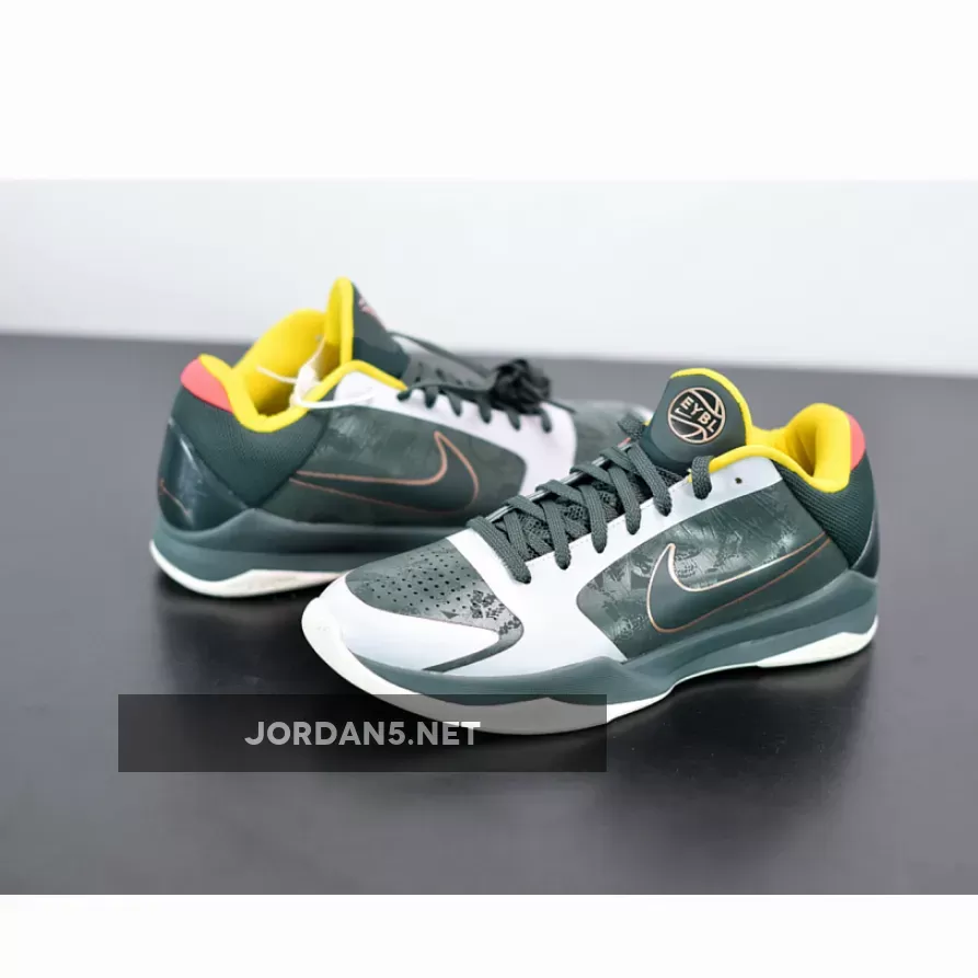 This Kobe 5 Protro EYBL PE makes use of a Forest Green base with a snake-skin pattern with a light grey overlay, while hits of yellow and salmon orange add a sudden contrast of pop on the interior lining and the heel. Highlighted with Dark Green throughout while Bronze is applied to the Swoosh logos and branding on the tongues. EYBL is seen on the left tongue, Yellow then covers the liner, Peach hits the heel while a graphic on the insoles and a White outsole finishes the look.