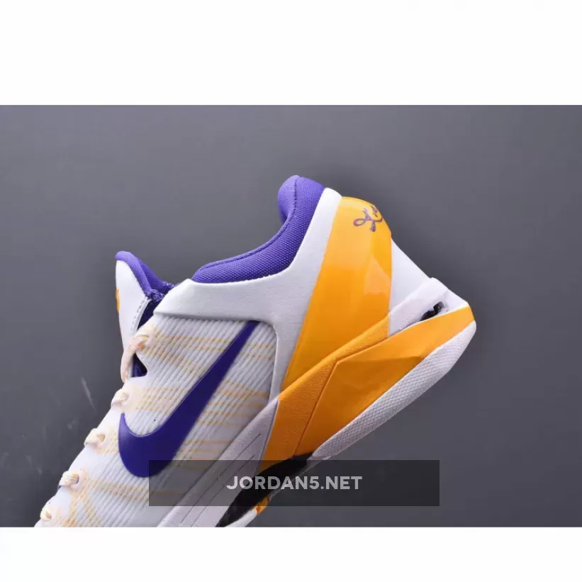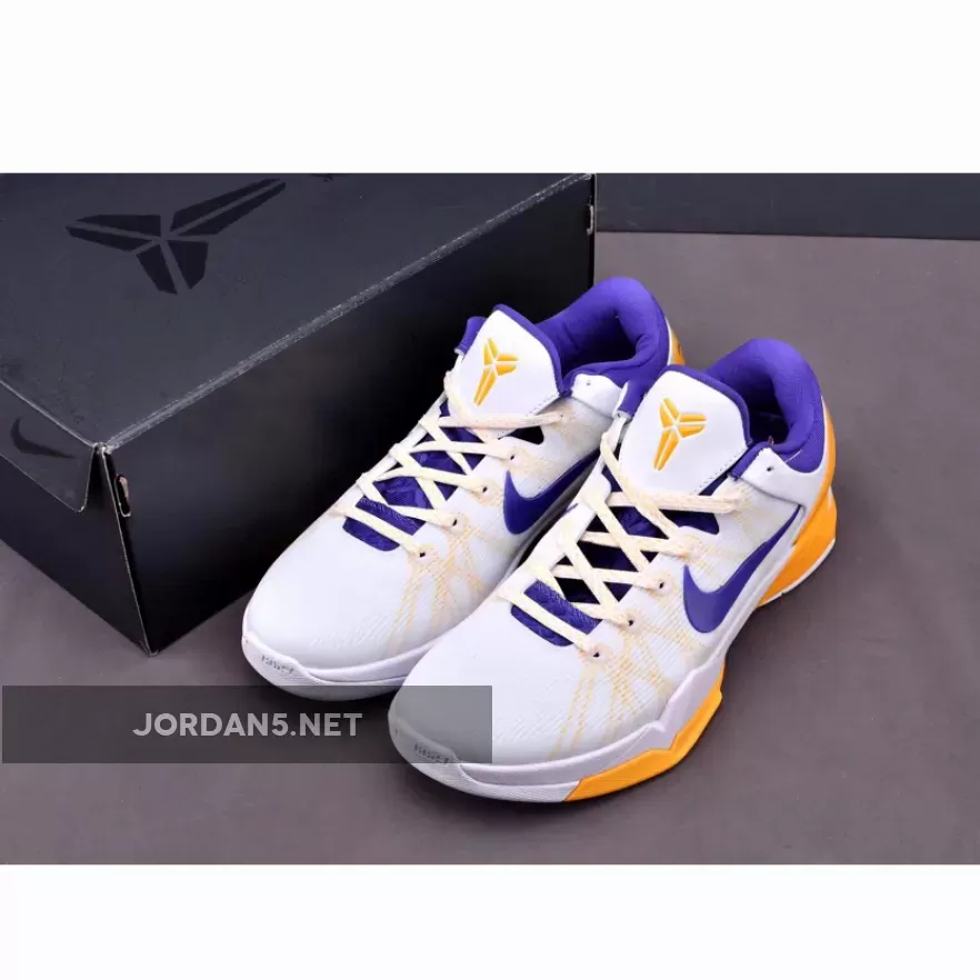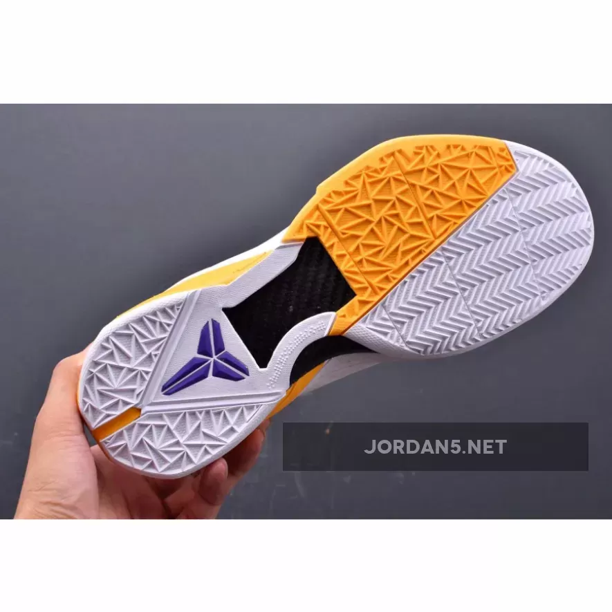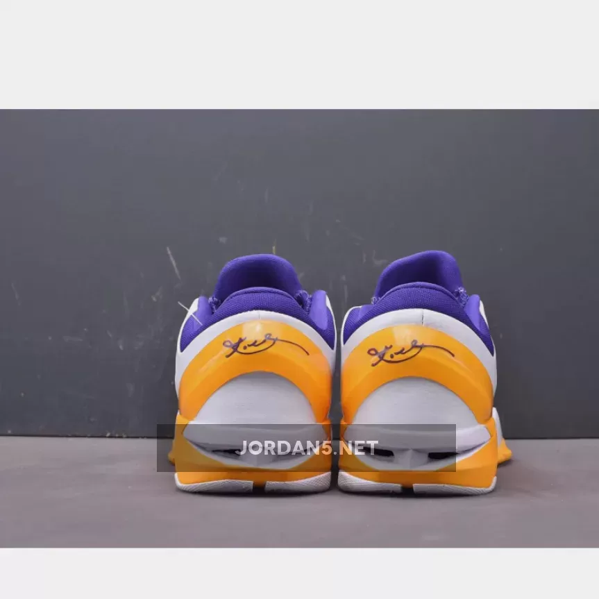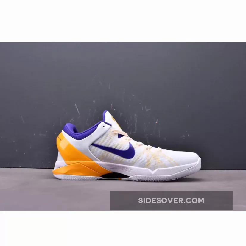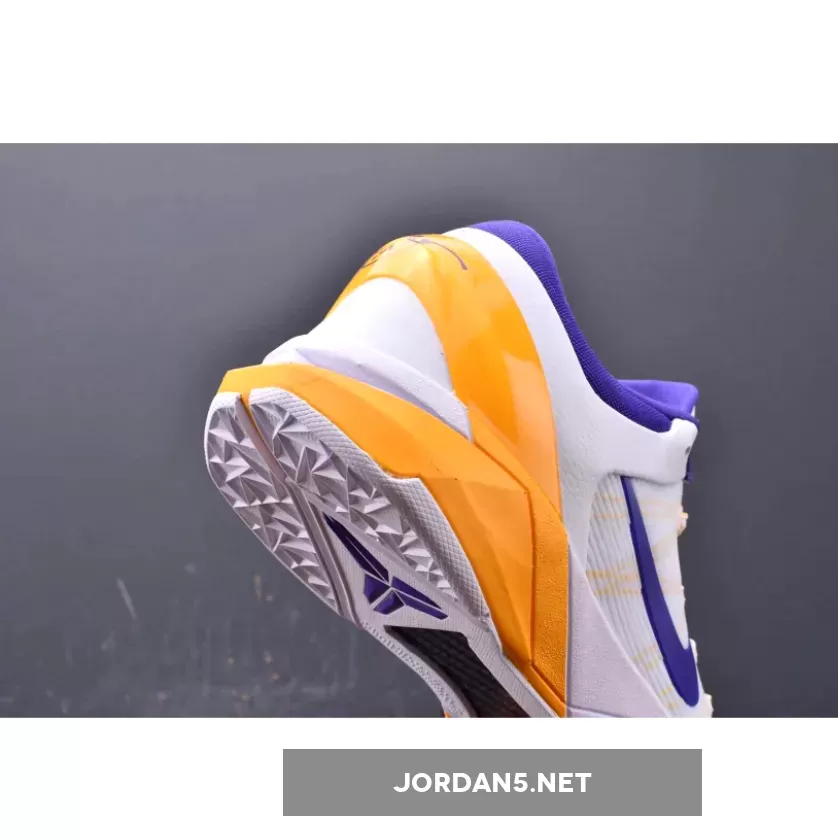 Kobe Bryant’s seventh signature shoe gets outfitted with a Los Angeles Lakers color palette, sporting a white Engineered Mesh upper with Del Sol Flywire cables. The heel counter and Zoom Air midsole also sport Del Sol, while Concord on the Swoosh and inner lining complete the team look.