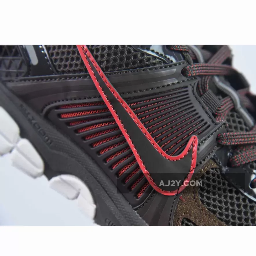 Smaller notes of a muted red accent through the flecked laces, borders of the Swooshes as well as the mesh layers that lie beneath the aforementioned cage.