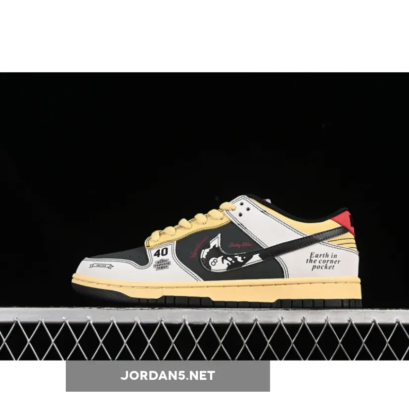 The SB Dunk Low showcases a bold black base accented by vibrant red, grey, and yellow hues. The design is further enriched through intricate patterns on both sides of the shoe: one side featuring a striking graphic resembling a skeleton holding up its hand while wearing sunglasses, paired with text reading “Earth in the corner pocket”. This unique motif contrasts beautifully against another panel adorned with classic skateboarding imagery like logos and numbers such as “40” and other subtle details.