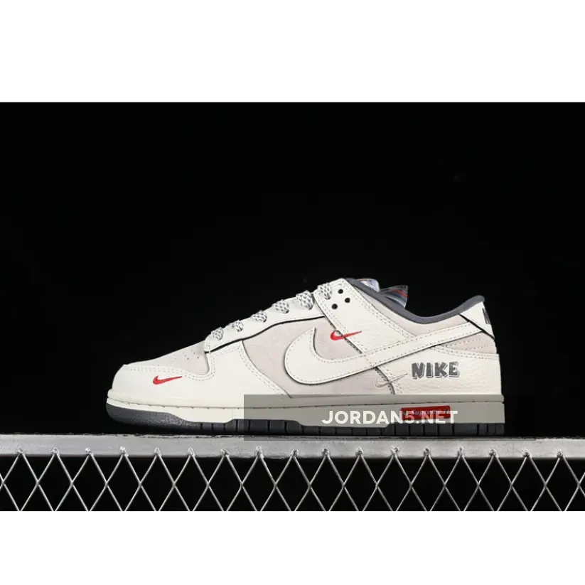 The SB Dunk Low showcases a sleek blend of grey, red, and white hues across its upper design. The iconic Nike swoosh is prominently displayed on both sides in vibrant red against the neutral tones of the material. This minimalist yet striking color scheme makes it stand out while maintaining timeless elegance. The clean lines and classic low-top silhouette ensure versatility suitable for various occasions from skateboarding to everyday wear.