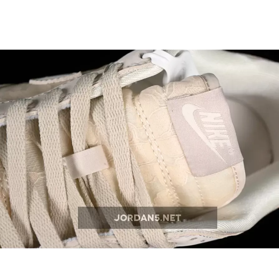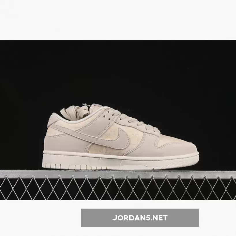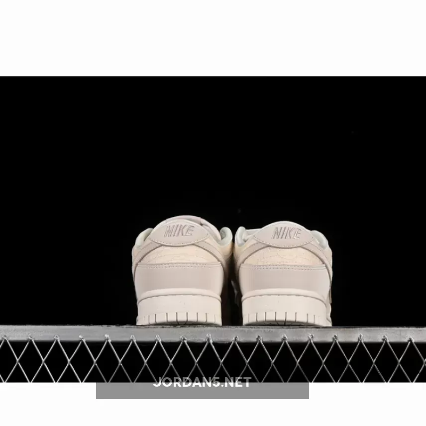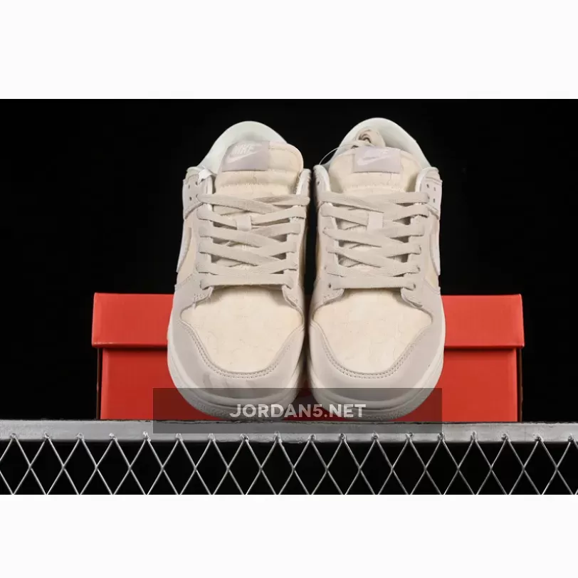The SB Dunk Low showcases a sophisticated blend of neutral tones, featuring shades of light orewood brown complementing coconut milk and soft pearl hues. The upper is adorned with intricate patterns reminiscent of woven textures, adding depth without overwhelming simplicity. This design choice elevates its aesthetic appeal while maintaining understated elegance—a hallmark of Nike’s signature branding on this iconic low-top model.