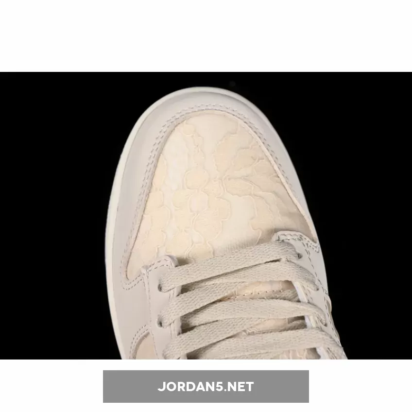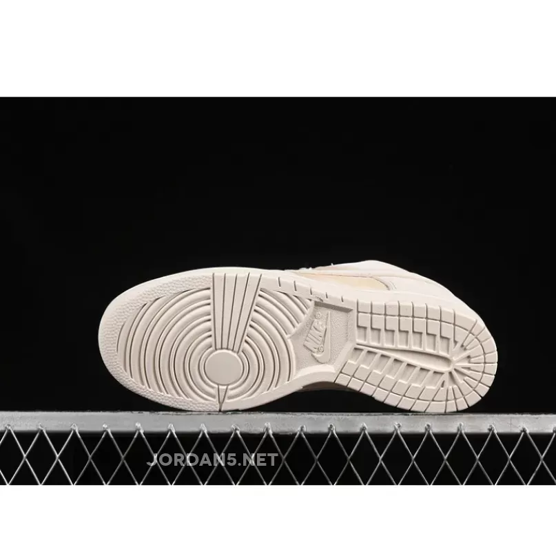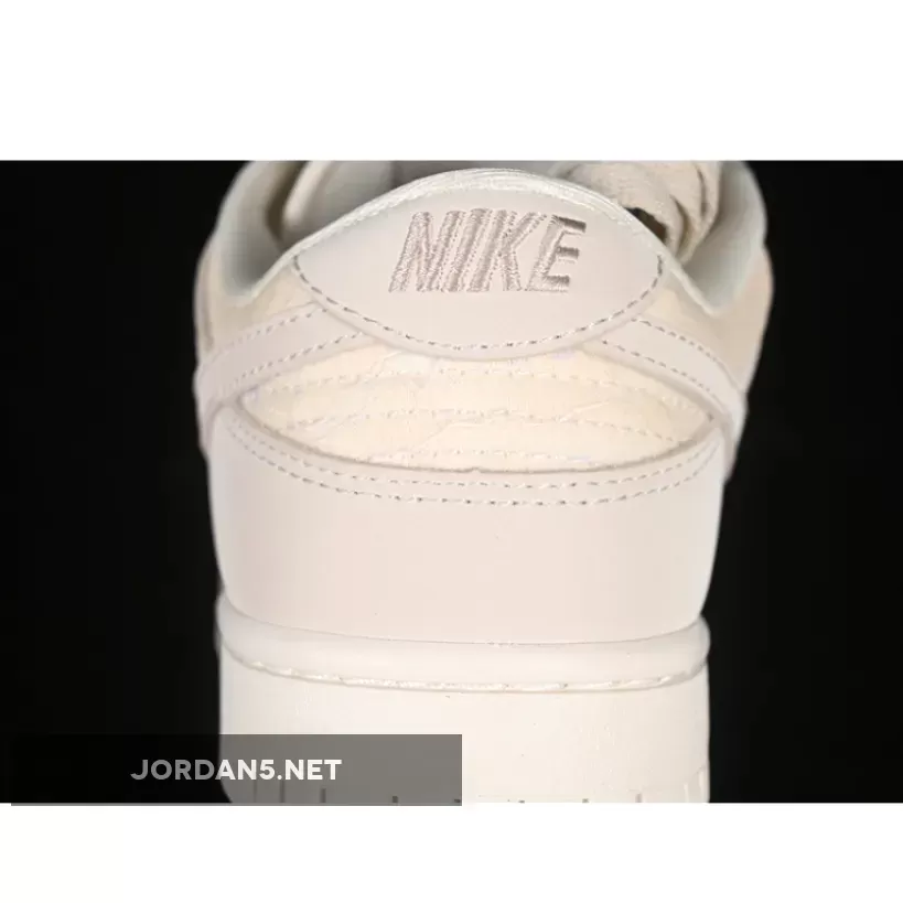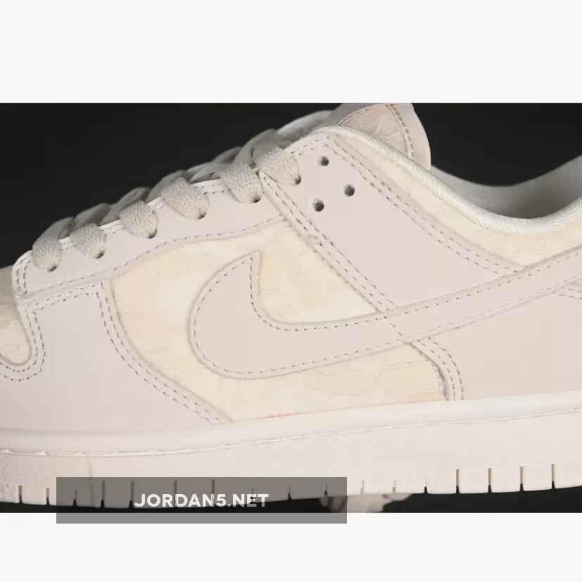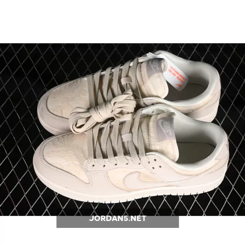 The SB Dunk Low showcases a sophisticated blend of neutral tones, featuring shades of light orewood brown complementing coconut milk and soft pearl hues. The upper is adorned with intricate patterns reminiscent of woven textures, adding depth without overwhelming simplicity. This design choice elevates its aesthetic appeal while maintaining understated elegance—a hallmark of Nike’s signature branding on this iconic low-top model.