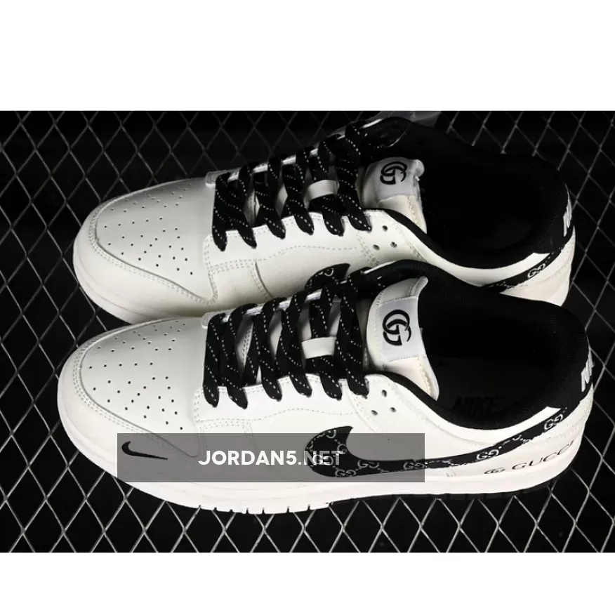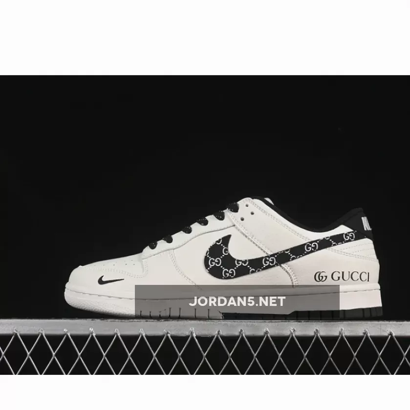 The SB Dunk Low Off White/Black showcases a striking monochrome palette of off-white and black hues. The sleek silhouette is accentuated by bold branding details: the iconic Nike Swoosh adorns one side while Gucci’s signature double G motif decorates another, creating a harmonious blend between two luxury brands. This unique design makes it stand out among other sneakers on shelves.