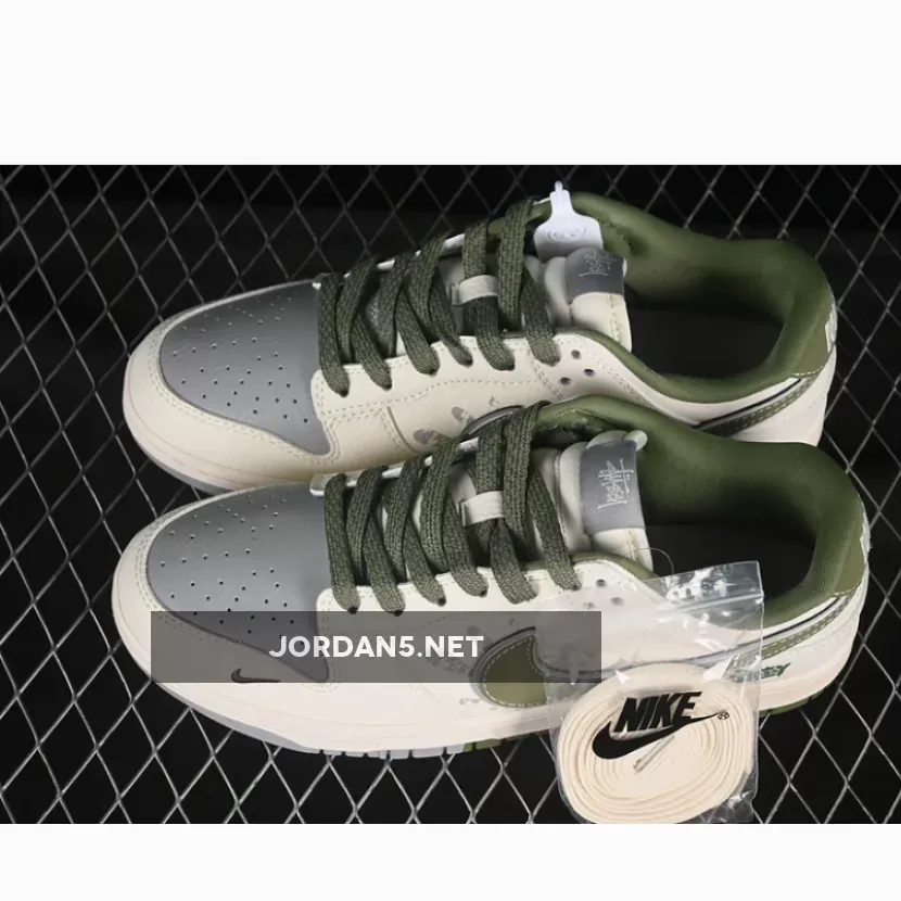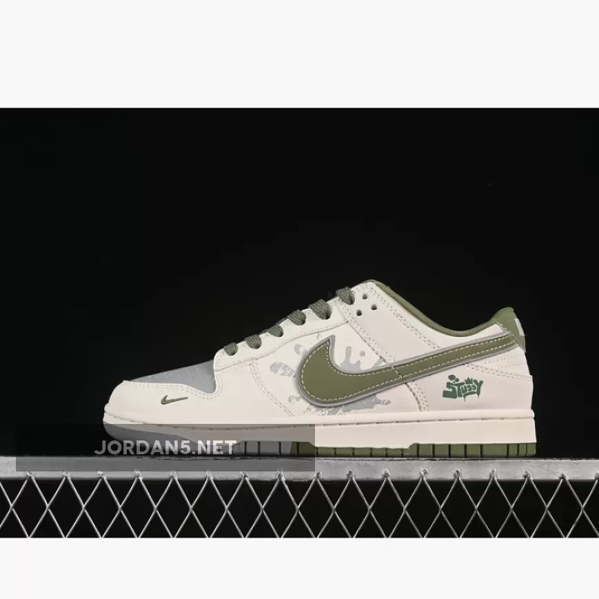 The SB Dunk Low Off White / Grey showcases a minimalist yet striking design. The off-white base provides a clean canvas, complementing the subtle grey accents on various parts of the upper including the heel tab and tongue label. Green details pop against this neutral backdrop: olive green laces tie together seamlessly at the eyelets; matching stitching lines add texture along side panels while also highlighting the Nike Swoosh positioned prominently near midfoot. This iconic swoop is rendered in matte finish giving it depth without overwhelming presence—a perfect balance between understated elegance & bold statement-making.