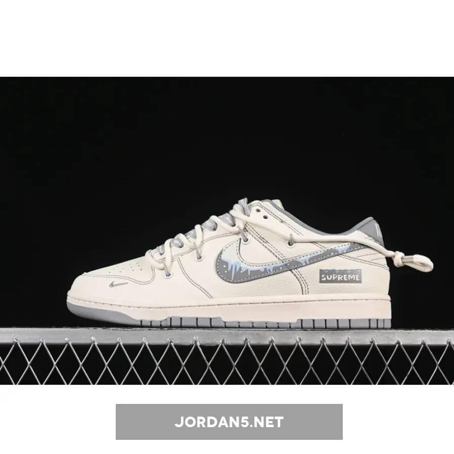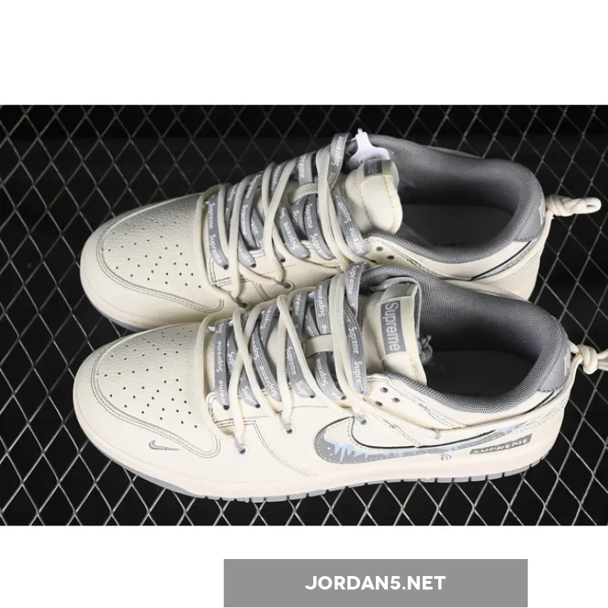 The SB Dunk Low Sup Off White/Gray showcases a minimalist yet striking design. The off-white base provides a clean canvas, complementing the subtle gray accents on various parts of the shoe including the Swoosh emblem, heel tab, laces, tongue label, midsole, outsole, toe cap, collar lining, and inner liner. This monochromatic palette is punctuated by small pops of light blue at key points like the Nike swoosh graphic near the ankle area which adds depth without overwhelming it—a hallmark feature often seen across Supreme collaborations.