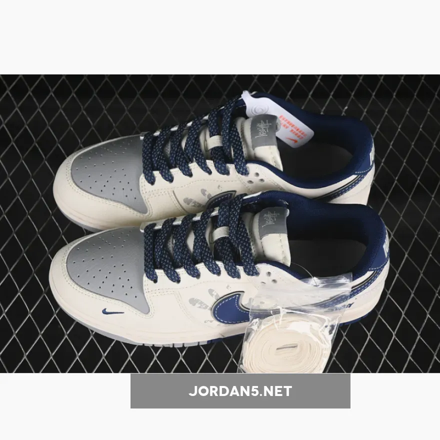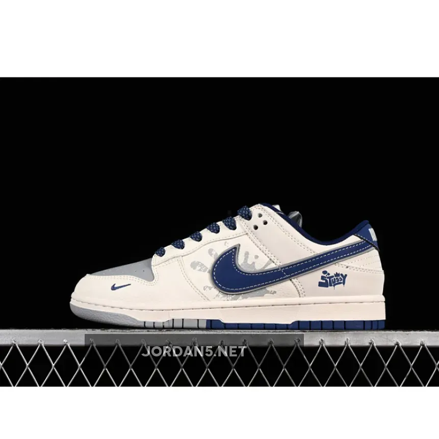 The SB Dunk Low White/Blue/Grey showcases a clean yet bold design, featuring a predominantly white upper accented by striking blue overlays on key areas like the tongue tab, heel counter, laces, and Swoosh logos. The subtle grey detailing adds depth without overwhelming the overall look. This color combination is both versatile enough for everyday wear while also making it stand out among other sneakers due to its unique blend of classic Nike branding and modern aesthetic touches.