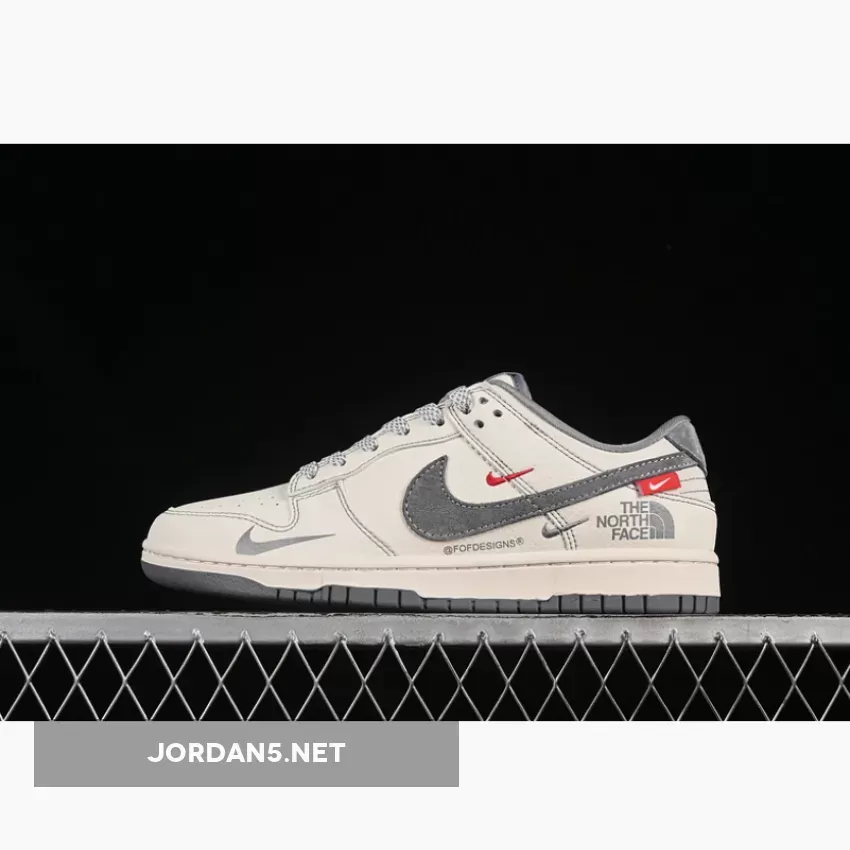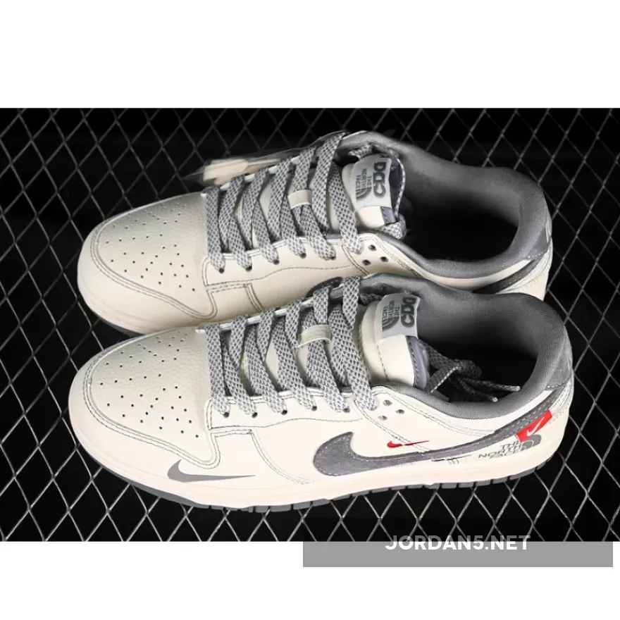 The SB Dunk Low showcases a clean yet bold design with its white base paired elegantly alongside gray accents on both the upper paneling and heel tab. The iconic Nike swoosh is rendered in metallic silver, adding depth against the monochrome palette while maintaining subtle contrast through red detailing at key points like the tongue tag and outsole. This combination of colors creates a versatile look suitable across various outfits without overpowering them.