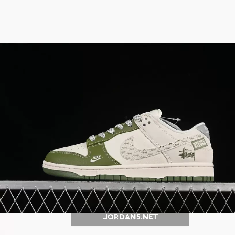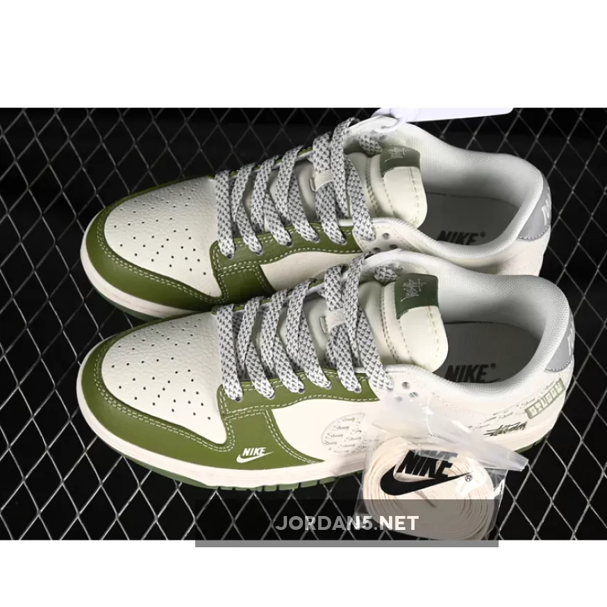 The SB Dunk Low showcases a striking white base paired elegantly with gray accents on its overlays, complementing the bold olive green of both the midsole and outsole. The iconic Nike swoosh is adorned with handwritten text patterns throughout, adding depth and character while maintaining clean lines across this classic low-top silhouette. Stussy’s signature branding graces one side, enhancing the overall aesthetic without overwhelming it—a perfect blend of skate culture sophistication.