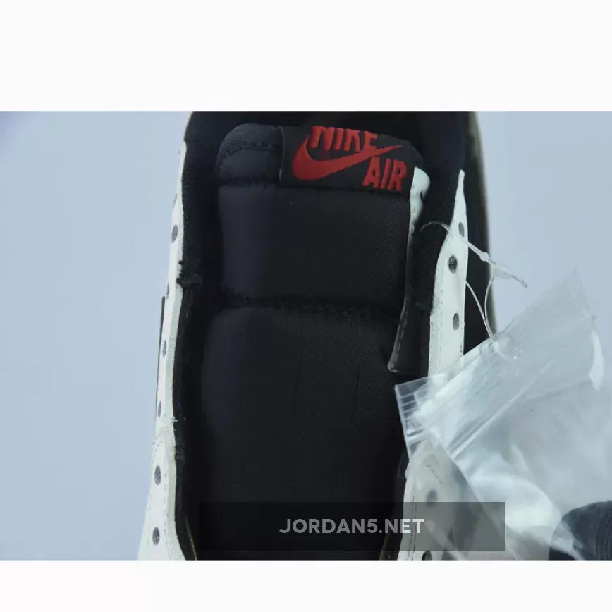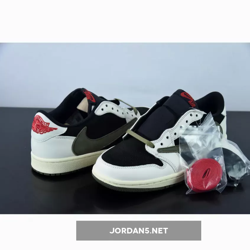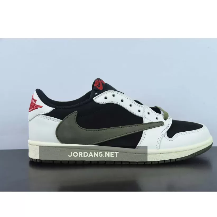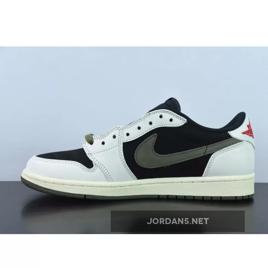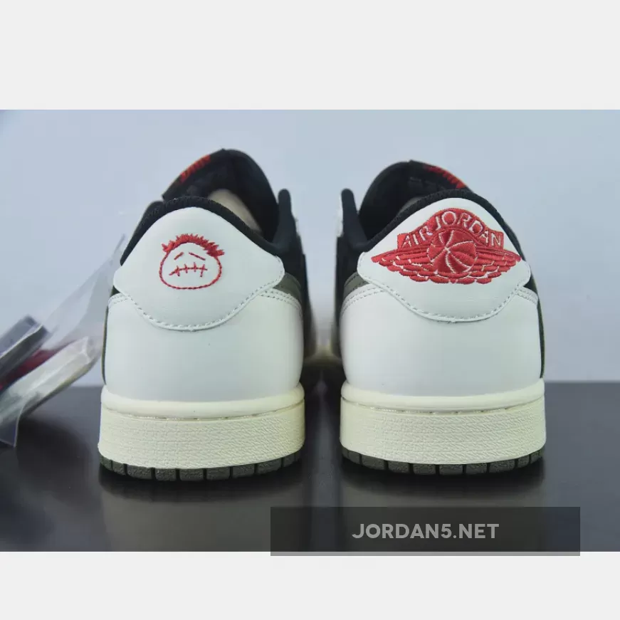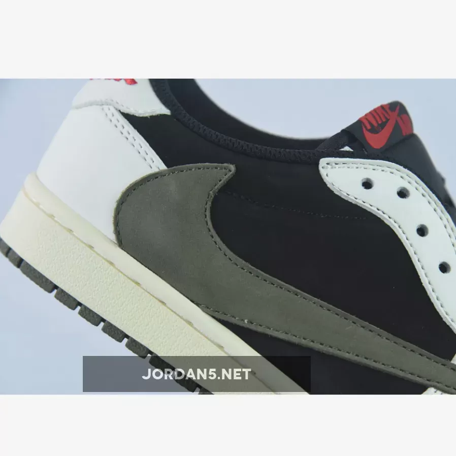 The sneaker is similar to the upcoming “Black/Sail” colorway of the Travis Scott x Air Jordan 1 Low OG that’s on the way this holiday season but features olive on the medial and lateral Swooshes as well as an olive outsole. The rest seems to be similar with a black suede base and white tumbled leather on the overlays and co-branding throughout with red accenting on the tongue tag.