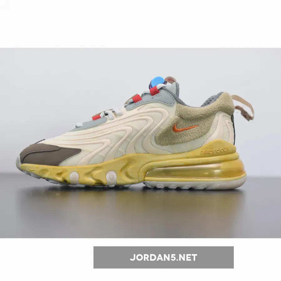 Earthy brown suede overlays on the toe box and heels bring the whole look together. Moving downwards, a chunky orange-yellow hybrid midsole encases a visible Air Unit at the heel. Likewise, the React foam moves upto the toe region, giving your feet comfort like never before. Stun the town with effortless style with these gorgeous Cactus Jack Brown.