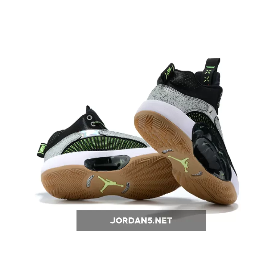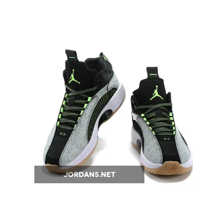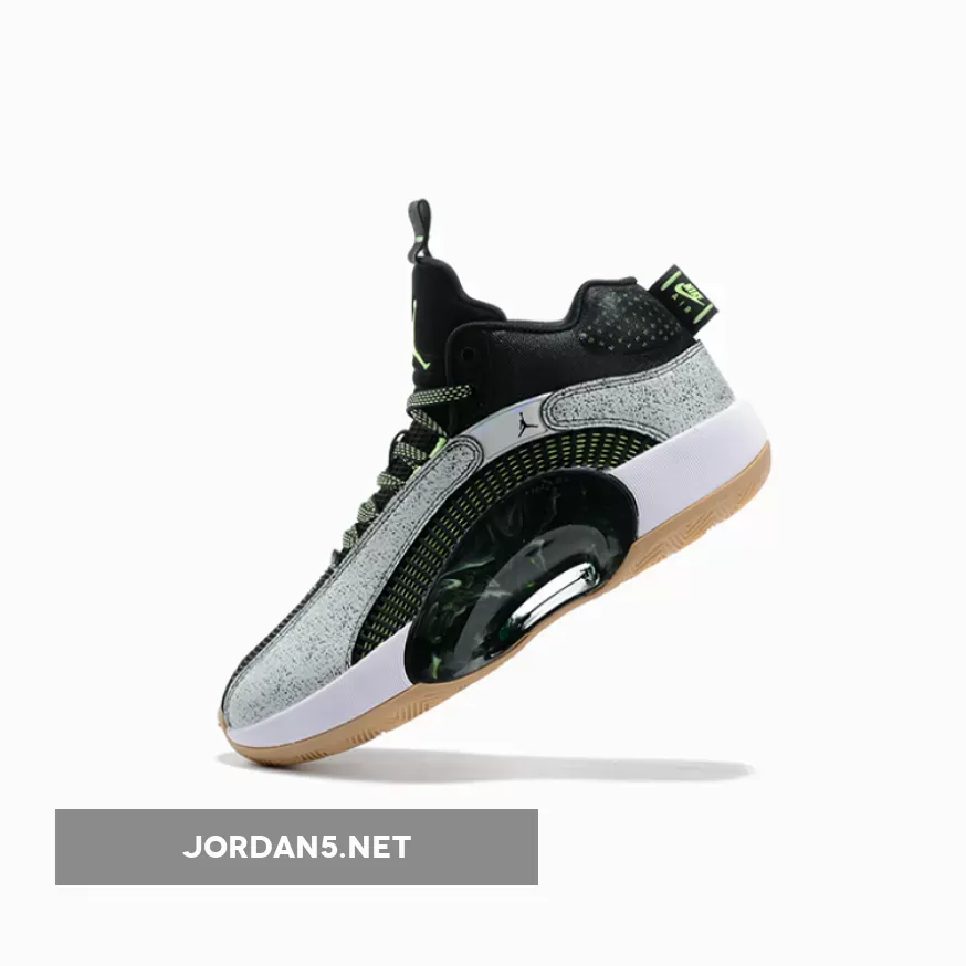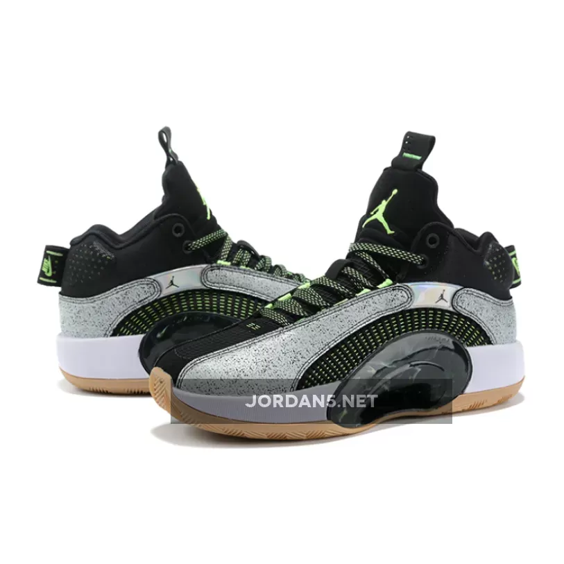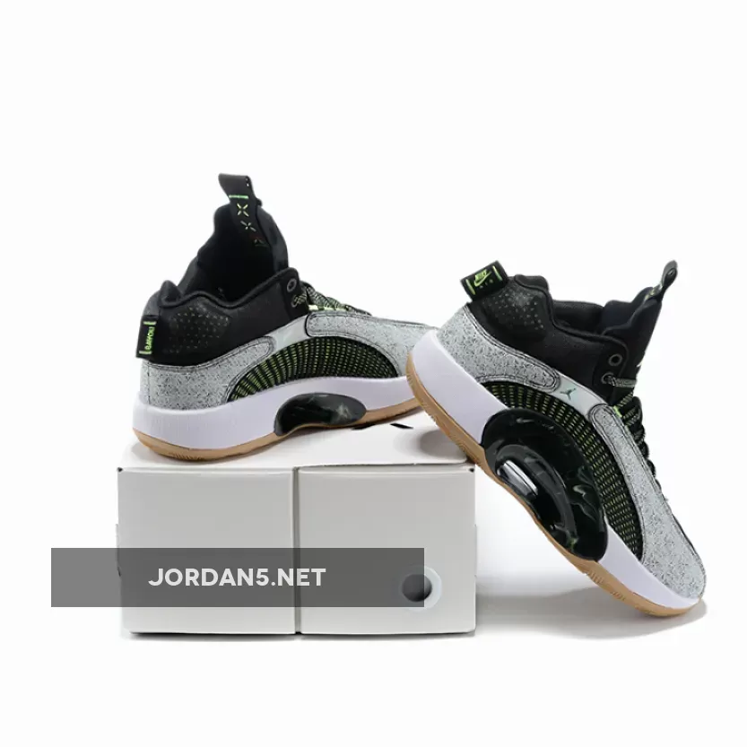 This Air Jordan 35 comes with a cracked leather on the overlays while Black mesh lands on the base. In addition, we have Barely Volt used on the eyelets, underneath the mesh on the panels, and Jumpman branding. Along with hits of Silver, 23 on the vamp, Zoom Air, they also have Black and Green marbleized detailing. Other highlights include the number 35 on the inside of the tongue and a Gum rubber outsole.